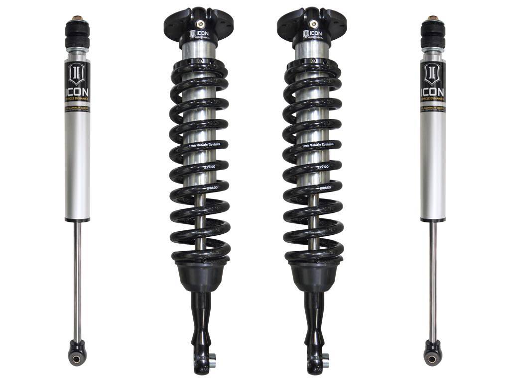 ICON Vehicle Dynamics Toyota Tundra Stage 1 suspension systems are designed with maximum performance and the serious driver in mind. ICON engineers primary focus is to increase wheel travel and damping ability, which translates into outstanding vehicle control and ride quality both on and off-road. The Stage 1 system includes vehicle-specific tuned 2.5†coilover shocks featuring an internal reservoir for exceptional cooling properties. These coilovers are also height adjustable from 1-3†allowing the use of larger, more aggressive wheel and tire combinations. ICON 2.0 VS Aluminum Series rear shocks utilize a vehicle-specific valving that balances the performance of the truck from front to rear. The ICON Vehicle Dynamics 2007-2021 Toyota Tundra Stage 1 suspension system is an excellent choice for those drivers looking to enhance the capabilities of their pickup on the road as well as in the dirt.