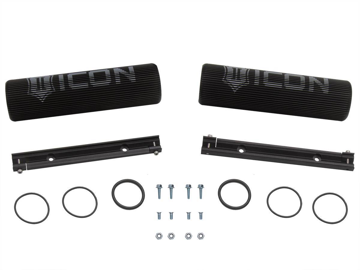 In an effort to continue our push for excellence ICON is proud to introduce finned reservoir upgrade kits for our 2.5 Series piggyback and remote reservoir shocks. These reservoir upgrade kits will improve the look of any ICON-equipped fender well while allowing for a cleaner install utilizing the included dove tail reservoir clamp. Aside from improving the aesthetics of an existing ICON shock, these finned reservoir kits have functional advantages as well. A surface area increase of 115% provides improved heat dissipation and allows for the shocks to be pushed harder for a longer duration of time before experiencing a reduction in damping ability. This is especially important in ICON CDC Valve shocks, as heat is generated in the reservoir as well as the shock body. Another functional benefit to these new ICON finned reservoirs is dent resistance. In extremely rare cases a standard aluminum reservoir can be hit with rocks or debris and if dented, affect the function of the shock. The design of the ICON finned reservoir increases rigidity, while utilizing a slightly larger outside diameter allowing the fins to take the brunt of potential off-road damage without distorting the inner sealing surface.;At this time ICON is not offering finned reservoirs as a production option, however these 2.5 Series Finned Reservoir Upgrade Kits can be installed by any ICON Authorized Shock Service Center. This 10†reservoir kit comes complete with a pair of finned reservoirs, dovetail reservoir clamps, and all necessary parts & hardware to complete the process.