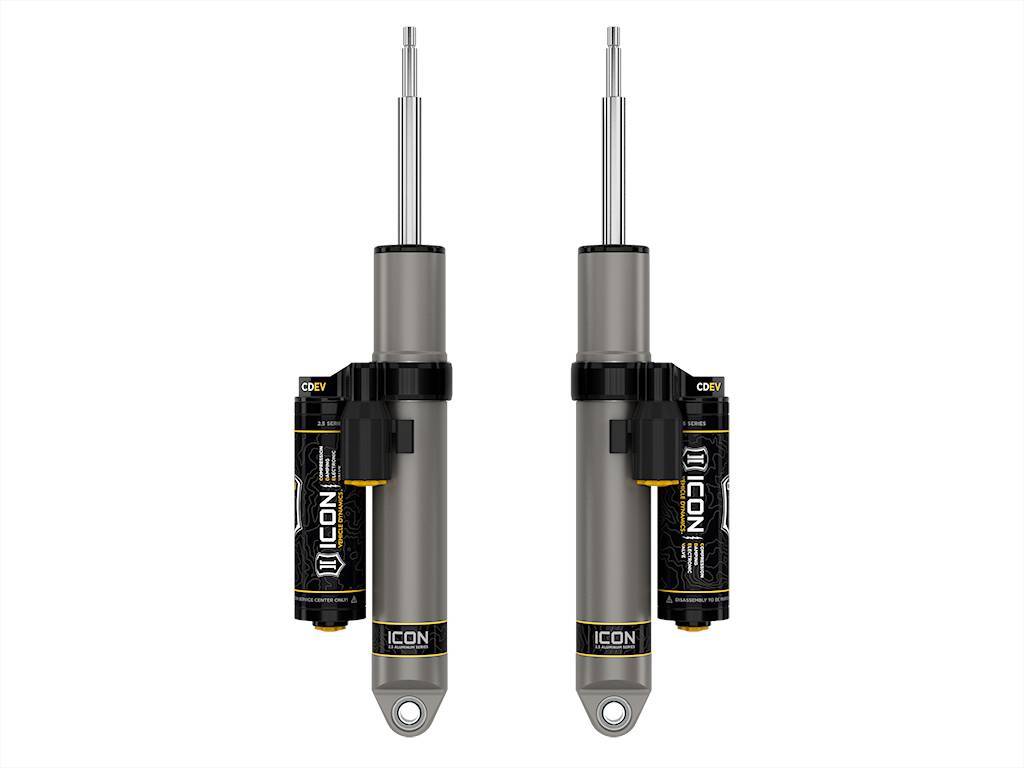 ICON Vehicle Specific (V.S.) 2.5 Aluminum Series shocks with CDEV are designed and built to give your vehicle outstanding performance off-road and a smooth ride on the street. These shocks are configured specifically for each application in both length and damping tune. For piggyback and specific remote reservoir applications, ICON'S unique use of a 6061-billet aluminum manifold a few inches below the top cap of the shock creates an internal Bump Zone that when used creates an additional 20% of damping force. This additional force helps prevent harsh bottom outs and controls the suspension when compressing at high velocity. Like all ICON'S Shock Absorbers, V.S. 2.5 Aluminum Series shocks with CDEV are fully rebuildable and re-tunable. The ICON CDE Valve upgrade is included for those desiring an easy way to tune the ride electronically from inside the vehicle.;Compression Damping Electronic Valve (CDEV) is an electronically controlled valve that meters the flow of oil to regulate the amount of damping force that is created by the shock when compressed. This infinitely variable valve can react in less than 40ms and has the ability to make extremely precise adjustments for varying terrain. CDEVs hydraulic circuits are also custom tailored per application to create the highest resolution and dynamic range allowable for each specific vehicle. Powered by ICON Intelligent Control and proprietary ICON mobile app, the system uses information from the onboard G-force sensor and Gyroscope to perform calculations based on algorithms and user-defined settings to predict terrain and adjust shock settings via the CDEV accordingly.