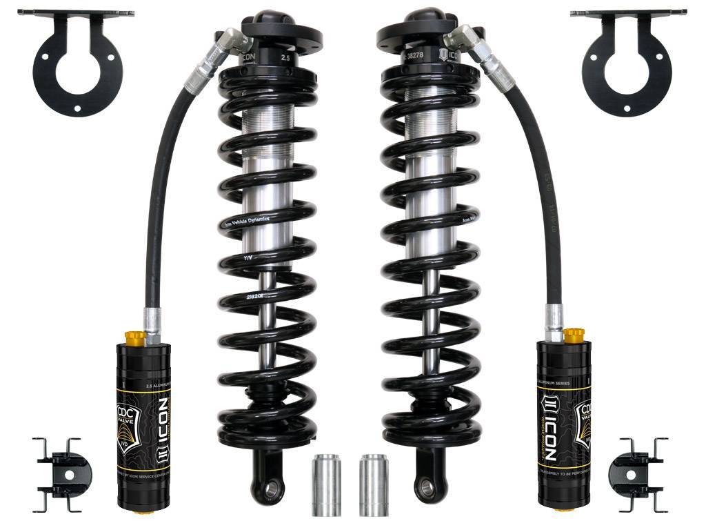ICON's 2.5 VS Series Remote Reservoir Bolt-In Coilover Conversion Kit will add a new level of performance and adjustability to 2005-UP F-250 and F-350 trucks. The advantage of utilizing a coilover conversion kit is that they have been designed to increase the overall damping ability of the vehicle while at the same time allowing for user-defined ride height adjustment. The 2.5" Remote Reservoir Coilover featured in these kits is based off of ICONs 2.5 VS Series shock line - meaning that features like Eibach coil springs, FK Rod End bearings, and vehicle-specific valving come standard. Quality machined components and a fully serviceable design make for a product that will stand the test of time, yet retain the ability to be rebuilt or revalved as necessary. ICONs CDC (Compression Damping Control) Valve option adds to the adjustability of these coilover conversion kits, allowing the end-user to adjust the ride characteristics of the vehicle with the turn of a knob.