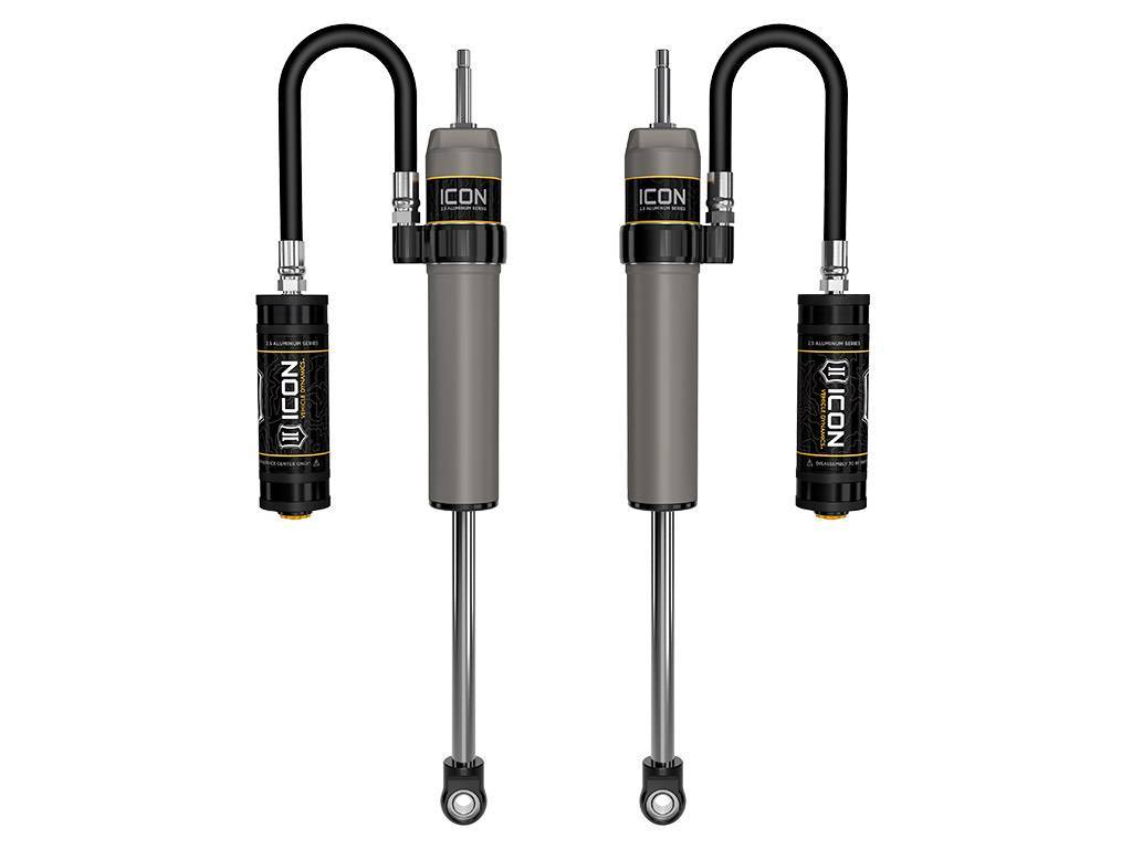 ICON Vehicle Specific (V.S.) 2.5 Aluminum Series shocks are designed and built to give your vehicle outstanding performance off-road and a smooth ride on the street. These shocks are configured specifically for each application in both length and damping tune. Like all ICON'S Shock Absorbers, V.S. 2.5 Aluminum Series shocks are 100% rebuildable and 100% revalveable. For piggyback and specific remote reservoir applications, ICON'S unique use of a 6061 billet aluminum manifold a few inches below the top cap of the shock creates an internal Bump Zone that when used creates an additional 20% of damping force. This additional force helps prevent harsh bottom outs and controls the suspension when compressing at high velocity. If you are looking for a more user defined tune, consider looking into the Compression Damping Control Valve (CDCV) shocks.