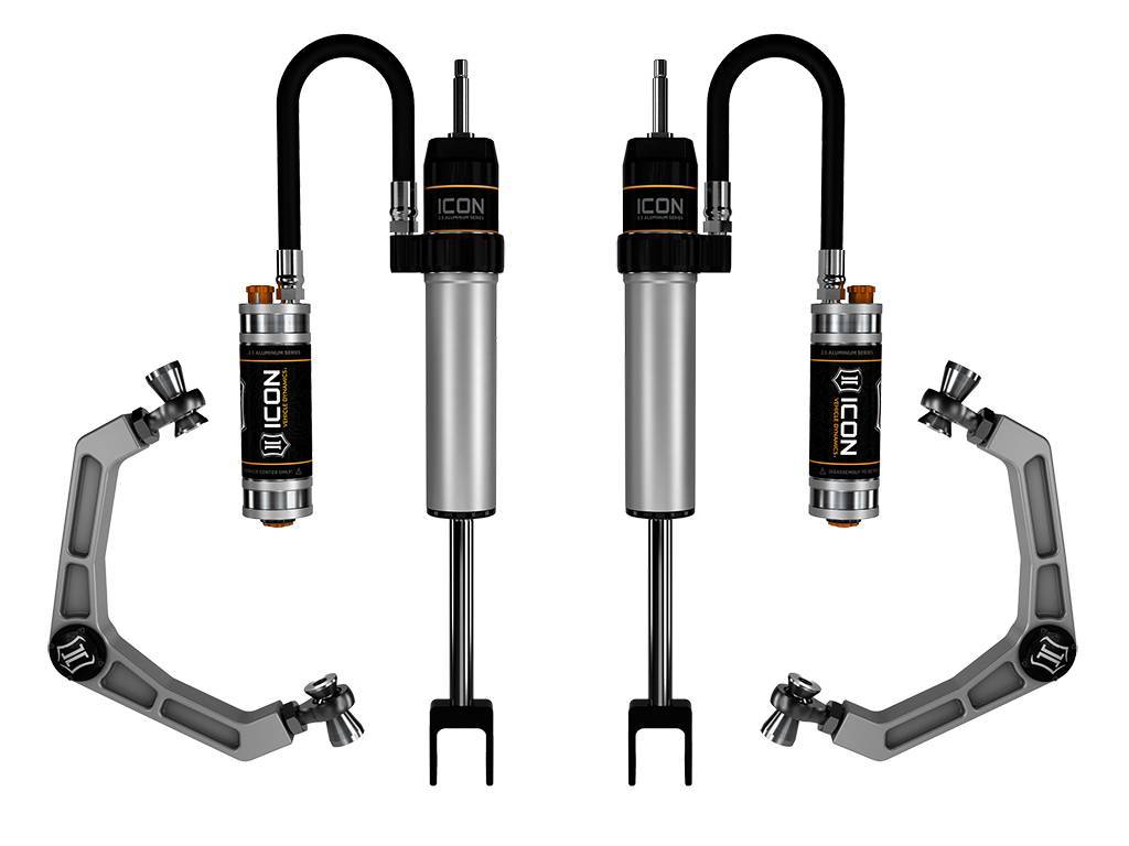 Take the performance of your 2020-Up GM HD truck to new levels with the ICON Vehicle Dynamics Delta Joint billet upper control arm kit. These are constructed of CNC machined 6061 billet aluminum merging light weight with high strength properties. FK Rod End 3/4†heim joints provide precise and smooth function throughout the range of travel while also allowing for additional camber and caster adjustment for optimal alignment specifications and confidence inspiring handling. A main benefit of ICON upper control arms is the increased wheel travel when paired with our 2.5 series shock absorbers, this translates into superior performance and ride quality for your 2020-Up GM HD.;These upper control arms feature ICON's patented Delta Joint. The Delta Joint is a heavy-duty high angle ball joint that combines the durability of a ball joint with the performance characteristics of a traditional uniball. While the industry standard uniball does a great job of allowing the control arms of a vehicle to articulate with little bind, they do have an inherent weakness that leaves more to be desired when used in a daily driven application - exposure to the elements. The Delta Joint features a zinc plated housing providing the first layer of corrosion resistance, while a tough grease seal keeps potentially harmful elements out of the inner workings of the joint. Metal on metal construction and a greaseable design increase the longevity of the Delta Joint while at the same time allowing for noise-free operation. What makes the Delta Joint unique is that it brings the best of both worlds to ICON upper control arms with features that make it more robust than a uniball, and at the same time capable of greater angularity than a typical ball joint.;To ensure compatibility, ICON is no longer offering GM 2500HD/3500HD upper control arms as individual components. Upper control arms can only be purchased in unison with ICON shock absorbers as a complete system. The included ICON Vehicle Specific (V.S.) 2.5 Aluminum Series shocks are designed and built to give your vehicle outstanding performance off-road and a smooth ride on the street. These shocks are configured specifically for each application in both length and damping tune. Like all of ICON's Shock Absorbers, the V.S. 2.5 Series shocks are 100% rebuildable and 100% revalveable. For piggyback and specific remote reservoir applications, ICON'S unique use of a 6061-billet aluminum manifold a few inches below the top cap of the shock creates an internal Bump Zone that when used creates an additional 20% of damping force. This additional force helps prevent harsh bottom outs and controls the suspension when compressing at high velocity. Remote reservoirs ensure optimum performance by increasing the duration of consistent damping regardless of situation, keeping the shocks at a cooler operating temperature during heavy use. The ICON CDC Valve is an externally adjustable valve that restricts oil flow into the reservoir which creates 10 levels of compression damping force ranges.
