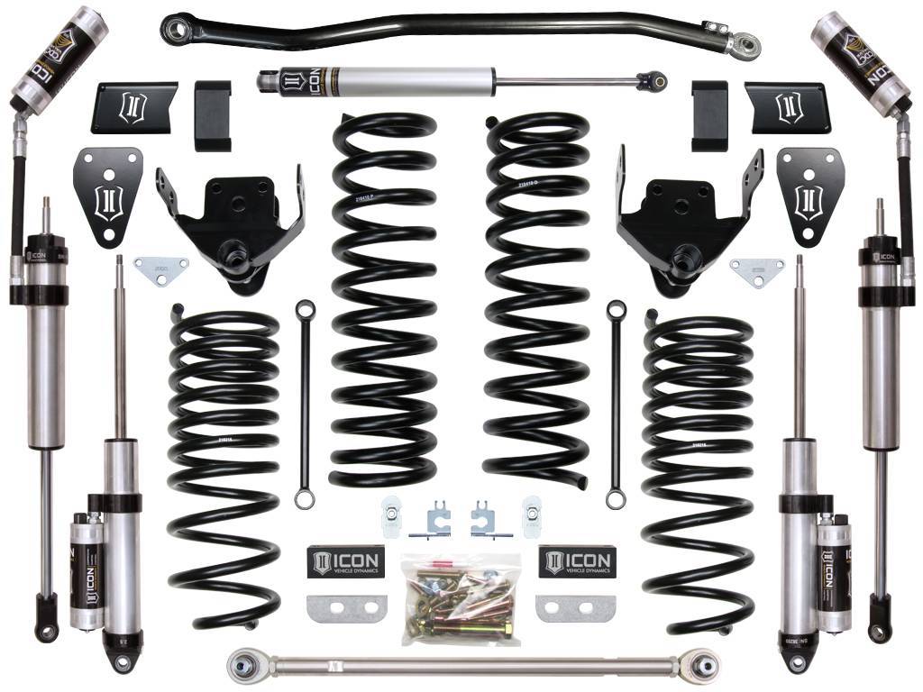 ICON Vehicle Dynamics suspension systems for the 2014-2018 Ram 2500 4WD were designed with exceptional performance and ride quality in mind. This Stage 4 system includes ICON-engineered 4.5†dual rate coil springs, high-strength laser cut bracketry, billet bump stop spacers, fabricated rear coil spacers, and all hardware necessary for a complete install. Vehicle-specific ICON 2.5 Aluminum Series remote reservoir shocks help deliver balanced performance front to rear, while CDC (Compression Damping Control) Valve technology allows the user to adjust compression characteristics of the shocks with the turn of a knob. These features make this Stage 4 system a huge upgrade for 2014-2018 Ram 2500 4WD trucks that are in need of a comfortable on-road ride, but also require the ability to be used to their full potential during spirited off-road driving.;This system includes multi-rate rear coil springs for a more compliant ride. The lighter initial rate of these performance rear coil springs helps the truck feel smoother and more controlled over washboard roads, small whoops, or similar terrain. The secondary rate allows the truck to maintain exceptional ride quality over larger obstacles, while at the same time retaining factory payload capacity (at a reduced ride height). These performance systems were specifically developed for the 3/4 ton truck enthusiast who enjoys aggressive off-road adventures and does not tow or haul heavy loads.