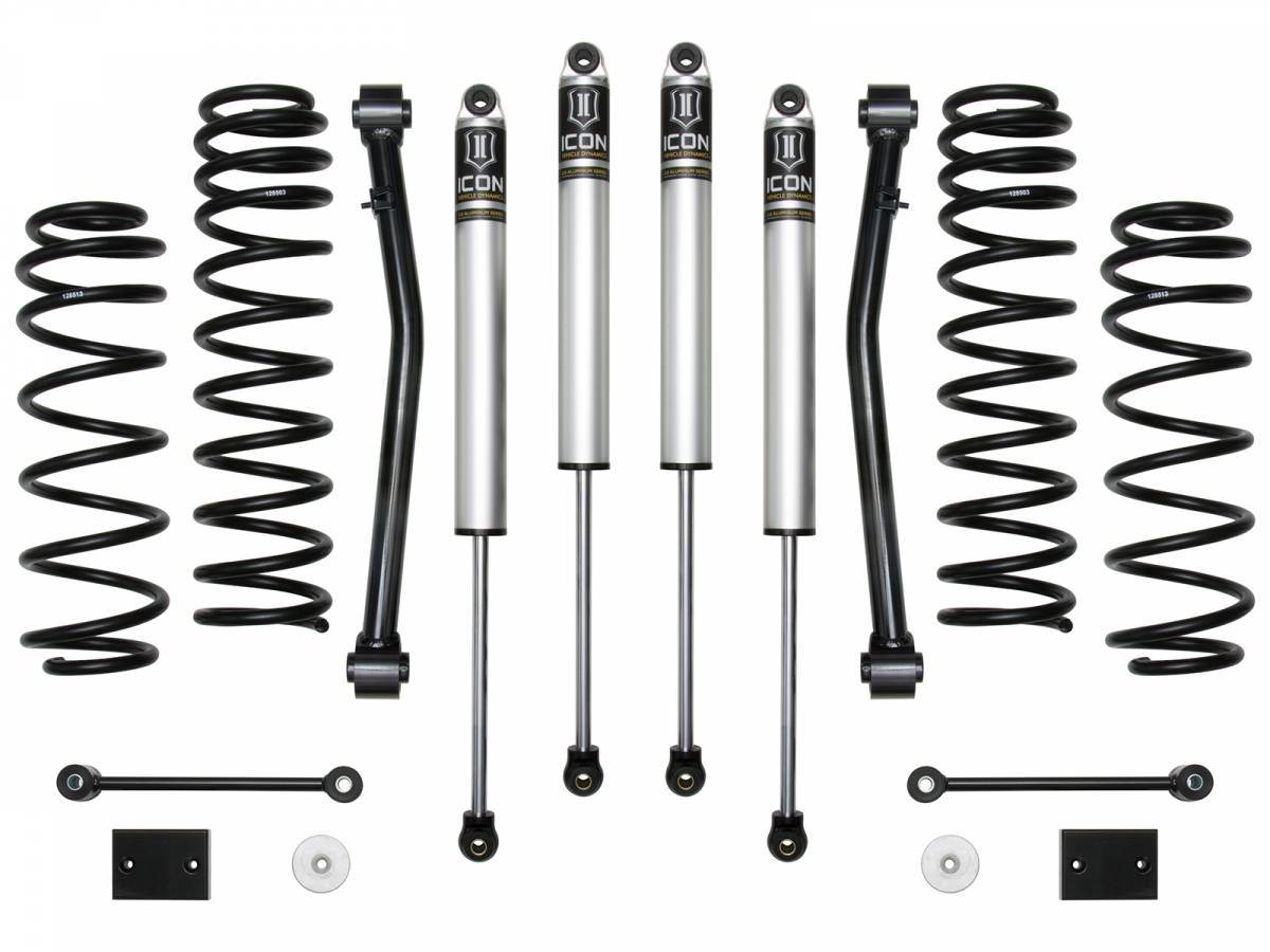 Through an accelerated testing process dubbed the “ICON1K†R&D program, ICON has logged over a thousand miles in the dirt pushing the JL to off-road extremes to identify limiting factors in OE components, develop products that remove these limits, and further extrapolate performance out of this vehicle. This 2.5†suspension system has been tweaked, tuned, and revised several times over the course of this ICON1K testing in an effort to provide unparalleled ride quality and vehicle dynamics for everything from rock crawling to high-speed desert running.;The ICON Vehicle Dynamics Stage 2 2.5" Suspension System for the 2018-UP Jeep Wrangler JL is designed for the driver looking to drastically improve the performance and ride quality of their vehicle. This Stage 2 system includes 2.5" lift dual rate coil springs, Vehicle Specific 2.0 Aluminum Series shocks, tubular steel front lower links, bump stop spacers, sway bar links, and all necessary hardware to complete the installation. With this combination of components, ICON was able to increase wheel travel numbers by over 30% (3" front, 2" rear), redefining the potential of the 2018-UP JL. The front lower links included with this system are constructed from thick wall steel tubing, provide increased castor numbers, and feature dual durometer bushings for noise free operation, maximum articulation, and minimal bind. The Stage 2 system allows for fitment of 35" tires when used with ICON's recommended wheel specifications. For users looking to install 37" tires, an optional bump stop spacer kit (PN: 22029) is available.;Holistic Engineering - the ICON Difference: When developing suspension components for a new vehicle, ICON takes a different approach than many others. Rather than focusing in on one particular part, ICON engineers look at the vehicle as a whole, identify inherent strengths and weaknesses, and set a target for performance. With a focus on maximizing wheel travel and improving ride quality, ICON will develop components that address (and often times replace) OE limiting factors. This "holistic engineering" philosophy often results in the development of several parts designed to work together as a system to provide a balanced on and off-road performance upgrade. Because ICON is designing and manufacturing all of the components necessary to improve the performance of a vehicle from front to back, end-users can rest easy knowing they are dealing with ONE manufacturer, ONE standard of quality, and ONE awesome warranty to back it all up.