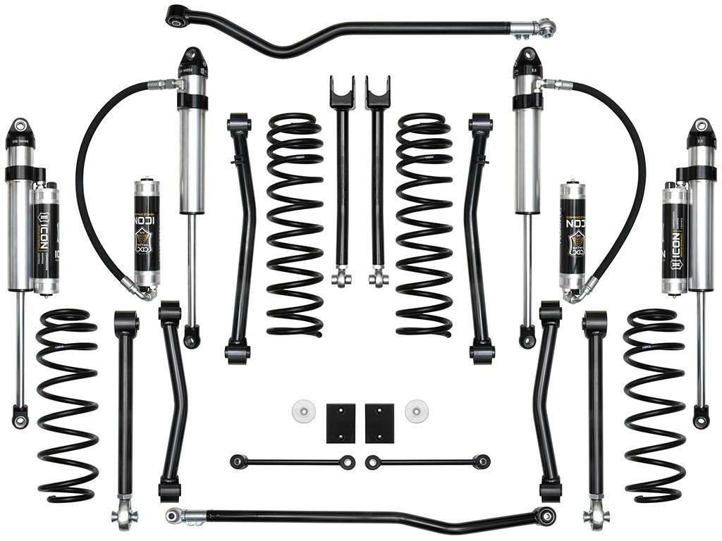 Through an accelerated testing process dubbed the “ICON1K†R&D program, ICON has logged over a thousand miles in the dirt pushing the JL to off-road extremes to identify limiting factors in OE components, develop products that remove these limits, and further extrapolate performance out of this vehicle. This 2.5†suspension system has been tweaked, tuned, and revised several times over the course of this ICON1K testing in an effort to provide unparalleled ride quality and vehicle dynamics for everything from rock crawling to high-speed desert running.;The ICON Vehicle Dynamics Stage 8 2.5" Suspension System for the 2018-UP Jeep Wrangler JL is designed for the driver looking to drastically improve the performance and ride quality of their vehicle. This Stage 8 system includes 2.5" lift dual rate coil springs, upgraded 2.5 Aluminum Series remote reservoir shocks with vehicle specific valving and ICON's CDC (Compression Damping Control) technology, tubular steel adjustable front upper links, fixed front lower links, fixed rear upper links, adjustable rear lower links, adjustable front and rear track bars, bump stop spacers, sway bar links, and all necessary hardware to complete the installation. With this combination of components, ICON was able to increase wheel travel numbers by over 30% (3" front, 2" rear), redefining the potential of the 2018-UP JL. The front lower links included with this system are constructed from thick wall steel tubing, provide increased castor numbers, and feature dual durometer bushings for noise free operation, maximum articulation, and minimal bind. The Stage 8 system allows for fitment of 35" tires when used with ICON's recommended wheel specifications. For users looking to install 37" tires, an optional bump stop spacer kit (PN: 22029) is available.;Holistic Engineering - the ICON Difference: When developing suspension components for a new vehicle, ICON takes a different approach than many others. Rather than focusing in on one particular part, ICON engineers look at the vehicle as a whole, identify inherent strengths and weaknesses, and set a target for performance. With a focus on maximizing wheel travel and improving ride quality, ICON will develop components that address (and often times replace) OE limiting factors. This "holistic engineering" philosophy often results in the development of several parts designed to work together as a system to provide a balanced on and off-road performance upgrade. Because ICON is designing and manufacturing all of the components necessary to improve the performance of a vehicle from front to back, end-users can rest easy knowing they are dealing with ONE manufacturer, ONE standard of quality, and ONE awesome warranty to back it all up.