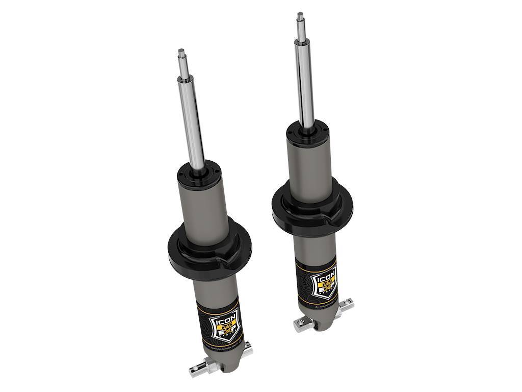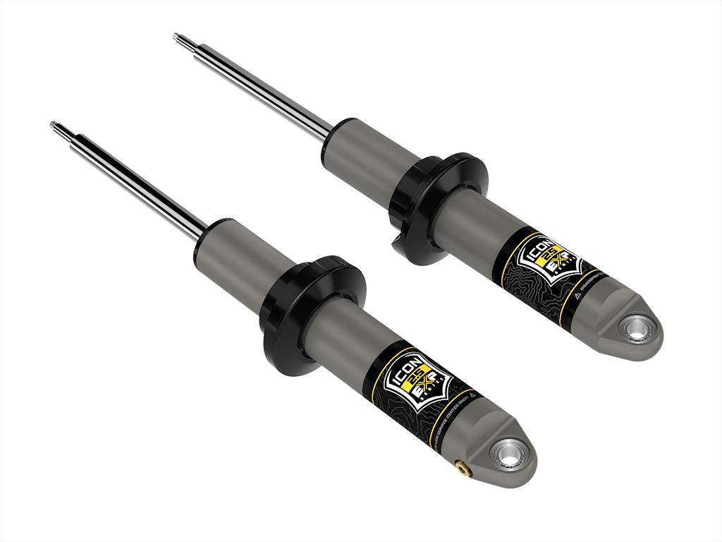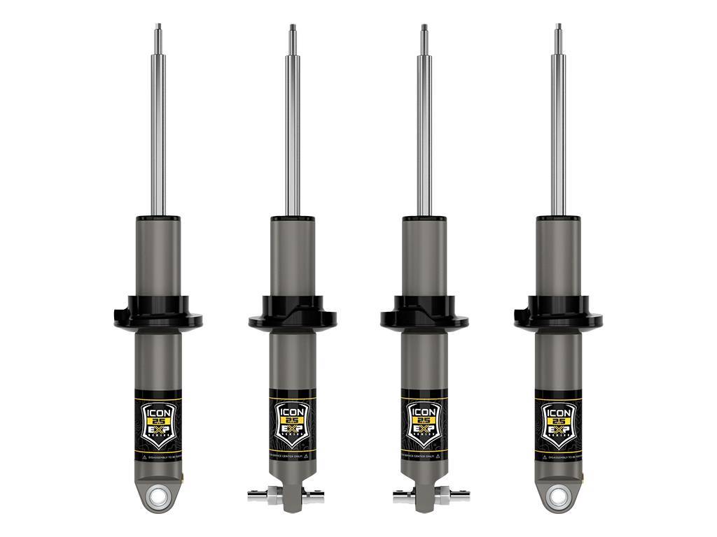 The ICON Vehicle Dynamics Stage 1 Suspension System for the 2021-2022 Ford Bronco features front and rear 2.5 EXP Series coilovers to yield increased wheel travel along with superior ride quality and suspension performance both on and off-road. 2.5 EXP Series coilovers combine the performance of a fully rebuildable 2.5-inch diameter premium shock absorber with the convenience and cost-benefits of re-using the Broncos factory coil spring and other components. EXP coilovers use a series of snap-ring grooves machined into the shock body to provide easily-selectable ride height adjustment from 1.375-3†of front lift and 1.5-2.25" of rear lift over stock on Broncos equipped with the OE HOSS 1.0 suspension package.;EXP Series is based on ICONs proven 2.5-inch diameter Aluminum Series shock absorber, featuring a one-piece impact-extruded aluminum shock body. Hard anodizing provides a great-looking, consistent finish with superior resistance to abrasion and corrosion. The massive 7/8-inch diameter shaft is induction hardened and chrome plated. EXP shocks use the factory shaft-up orientation, with the shaft ends machined to re-use the Broncos OE upper shock and spring mounts.;EXP Series shocks utilize a one-piece digressive piston design and are custom tuned for the Bronco in conjunction with their stock coil springs to maximize damping performance and provide unsurpassed ride quality, on and off-road. The increased piston size and shock oil volume provided by the 2.5-inch diameter aluminum body also provide superior heat dissipation compared to the smaller, steel bodied OE shocks, resulting in longer-lasting shock performance over prolonged use at higher speeds and through rougher terrain. For those who would like to further tune their suspension, EXP shocks are fully re-valvable (and rebuildable) by any qualified shock technician, with parts available from ICON.;HOSS 1.0 is Ford's "base" suspension system for Broncos with the Base, Big Bend, Outer Banks and Black Diamond trim levels WITHOUT the Sasquatch package. HOSS 1.0 is most easily identified by the BLACK shock bodies of the OE shocks.