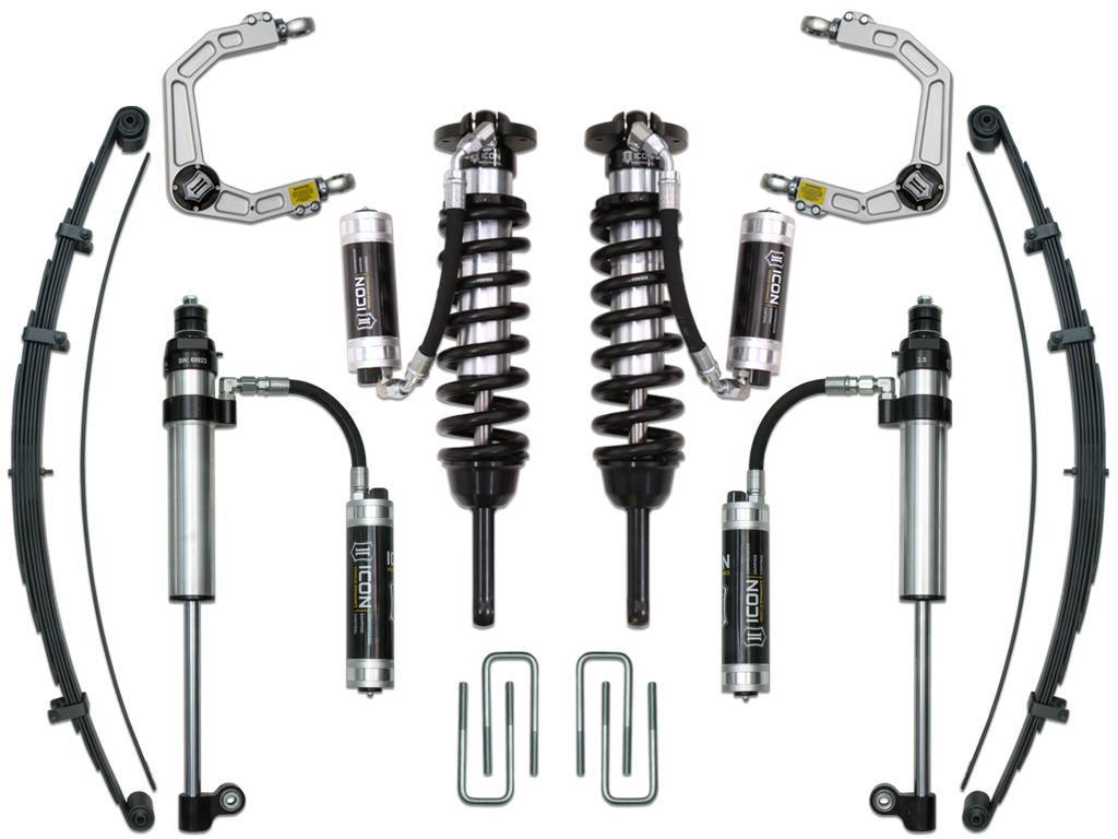 ICON Vehicle Dynamics 2005-UP Toyota Tacoma suspension systems are designed with maximum performance and the serious driver in mind. Throughout the development of these systems ICON engineers primary focus is to increase wheel travel and damping ability, which translates into outstanding vehicle control and ride quality both on and off-road. This Stage 9 system goes a step further in delivering ICON performance to the Tacoma with the addition of rear suspension components that include an ICON RXT multi-rate leaf spring and a unique RXT-specific 2.5 Series shock.;The Stage 9 system includes vehicle-specific tuned 2.5 Series Extended Travel coilover shocks equipped with ICON's CDC (Compression Damping Control) Valve. The easy-to-adjust CDC Valve allows for end-user compression changes to provide optimal ride quality across all types of terrain and vehicle cargo configurations. In addition, the coilovers feature a remote reservoir for exceptional cooling properties, ICON-engineered Eibach coil springs for superior vehicle “feel†through the range of travel, and are height adjustable from 0-3.5†for 2005-2015 models or 0-2.75" for 2016-Up models, allowing the use of larger, more aggressive wheel and tire combinations. Used in conjunction with the included ICON upper control arm, these extended travel coilovers add increased droop travel to the front suspension. To increase the ride quality of the truck and gain additional droop travel, the ICON RXT multi-rate leaf springs are added to the rear. Designed with an additional leaf (included with kit) that can be exchanged or added to the pack to yield an additional 10-20% spring rate, this leaf spring is perfect for drivers seeking improved rear ride quality in an “unloaded†vehicle as well as those that are have outfitted their trucks with a significant amount of weight in the form of a bed rack, roof top tent, spare tires, parts, or other additions. To compliment this increase in rear wheel travel the Stage 9 system includes a unique 2.5 Aluminum Series CDC remote reservoir shock that features a side-mount eyelet making it shorter in collapsed length, longer at extension, and still fit in the factory mounting location. This shock also features ICON's CDC technology for simple compression adjustability, and a large ten inch remote reservoir was added to aid in heat dissipation and resist shock fade during spirited driving.;This system features billet aluminum upper control arms with ICON's patented Delta Joint. The Delta Joint is a heavy duty high angle ball joint that combines the durability of a ball joint with the performance characteristics of a traditional uniball. While the industry standard uniball does a great job of allowing the control arms of a vehicle to articulate with little bind, they do have an inherent weakness that leaves more to be desired when used in a daily driven application - exposure to the elements. The Delta Joint features a zinc plated housing providing the first layer of corrosion resistance, while a tough grease seal keeps potentially harmful elements out of the inner workings of the joint. Metal on metal construction and a greasable design increase the longevity of the Delta Joint while at the same time allowing for noise-free operation. What makes the Delta Joint unique is that it brings the best of both worlds to ICON upper control arms with features that make it more robust than a uniball, and at the same time capable of greater angularity than a typical ball joint.