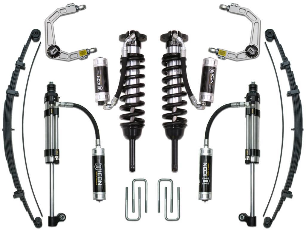 ICON Vehicle Dynamics 2005-UP Toyota Tacoma suspension systems are designed with maximum performance and the serious driver in mind. Throughout the development of these systems ICON engineers primary focus is to increase wheel travel and damping ability, which translates into outstanding vehicle control and ride quality both on and off-road. This Stage 10 system goes a step further in delivering ICON performance to the Tacoma with the addition of rear suspension components that include an ICON RXT multi-rate leaf spring and a unique RXT-specific 2.5 Aluminum Series shock.;The Stage 10 system includes vehicle-specific tuned 2.5 Series Extended Travel coilover shocks equipped with ICON's CDC (Compression Damping Control) Valve. The easy-to-adjust CDC Valve allows for end-user compression changes to provide optimal ride quality across all types of terrain and vehicle cargo configurations. In addition, the coilovers feature a remote reservoir for exceptional cooling properties, ICON-engineered Eibach coil springs for superior vehicle “feel†through the range of travel, and are height adjustable from 0-3.5†of lift over stock for 2005-2015 models or 0-2.75" of lift for 2016-UP models, allowing the use of larger, more aggressive wheel and tire combinations. Used in conjunction with the included ICON upper control arm, these extended travel coilovers add increased droop travel to the front suspension. To increase the ride quality of the truck and gain additional droop travel, the ICON RXT multi-rate leaf springs are added to the rear. Designed with an additional leaf (included with kit) that can be exchanged or added to the pack to yield an additional 10-20% spring rate, this leaf spring is perfect for drivers seeking improved rear ride quality in an “unloaded†vehicle as well as those that are have outfitted their trucks with a significant amount of weight in the form of a bed rack, roof top tent, spare tires, parts, or other additions. To compliment this increase in rear wheel travel the Stage 10 system includes a unique 2.5 Aluminum Series remote reservoir Omega bypass shock that features a side-mount eyelet that making it shorter in collapsed length, longer at extension, and still fits in the factory mounting location. This shock combines vehicle-specific valving with compression and rebound adjustment giving end-users ultimate control of performance and ride quality while a large ten-inch remote reservoir was also added to aid in heat dissipation and resist shock fade during spirited driving.;This system features billet aluminum upper control arms with ICON's patented Delta Joint. The Delta Joint is a heavy duty high angle ball joint that combines the durability of a ball joint with the performance characteristics of a traditional uniball. While the industry standard uniball does a great job of allowing the control arms of a vehicle to articulate with little bind, they do have an inherent weakness that leaves more to be desired when used in a daily driven application - exposure to the elements. The Delta Joint features a zinc plated housing providing the first layer of corrosion resistance, while a tough grease seal keeps potentially harmful elements out of the inner workings of the joint. Metal on metal construction and a greasable design increase the longevity of the Delta Joint while at the same time allowing for noise-free operation. What makes the Delta Joint unique is that it brings the best of both worlds to ICON upper control arms with features that make it more robust than a uniball, and at the same time capable of greater angularity than a typical ball joint.