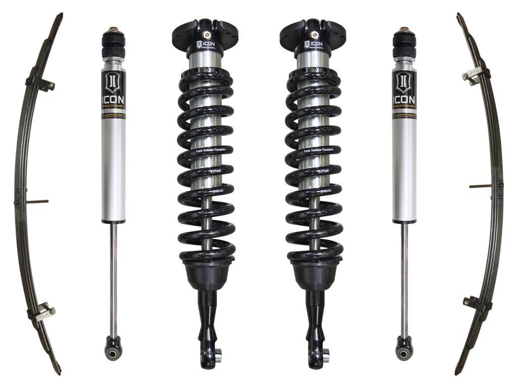 ICON Vehicle Dynamics Toyota Tundra Stage 2 suspension systems are designed with maximum performance and the serious driver in mind. ICON engineers primary focus is to increase wheel travel and damping ability, which translates into outstanding vehicle control and ride quality both on and off-road. The Stage 2 system includes vehicle-specific tuned 2.5†coilover shocks featuring an internal reservoir for exceptional cooling properties. These coilovers are also height adjustable from 1-3†of lift allowing the use of larger, more aggressive wheel and tire combinations. ICON 2.0 VS Aluminum Series monotube rear shocks utilize a vehicle-specific valving and then when combined with ICON's expansion pack give you the performance of the truck from front to rear. The ICON Vehicle Dynamics 2007-2021 Toyota Tundra Stage 2 suspension system is an excellent choice for those drivers looking to enhance the capabilities of their pickup on the road as well as in the dirt.