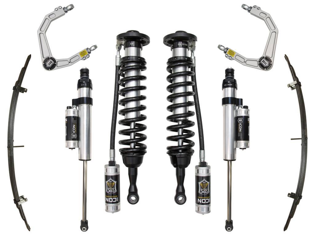 ICON Vehicle Dynamics Toyota Tundra Stage 6 suspension systems are designed with maximum performance and the serious driver in mind. ICON engineers primary focus is to increase wheel travel and damping ability, which translates into outstanding vehicle control and ride quality both on and off-road. The Stage 6 system includes vehicle-specific tuned 2.5†coilover shocks featuring remote reservoirs for exceptional cooling properties and includes our Compression Damping Control Valve (CDCV) for 10 clicks of tool free adjustment. These coilovers are also height adjustable from 1-3†of lift over stock, allowing the use of larger, more aggressive wheel and tire combinations. ICON 2.5 Aluminum Series rear shocks utilize our CDCV valving that makes your suspension tunable front and rear. The ICON Vehicle Dynamics 2007-2021 Toyota Tundra Stage 6 suspension system is an excellent choice for those drivers looking to tune the capabilities of their pickup on the road as well as in the dirt.;This system features upper control arms with ICON's patented Delta Joint. The Delta Joint is a heavy duty high angle ball joint that combines the durability of a ball joint with the performance characteristics of a traditional uniball. While the industry standard uniball does a great job of allowing the control arms of a vehicle to articulate with little bind, they do have an inherent weakness that leaves more to be desired when used in a daily driven application - exposure to the elements. The Delta Joint features a zinc plated housing providing the first layer of corrosion resistance, while a tough grease seal keeps potentially harmful elements out of the inner workings of the joint. Metal on metal construction and a greasable design increase the longevity of the Delta Joint while at the same time allowing for noise-free operation. What makes the Delta Joint unique is that it brings the best of both worlds to ICON upper control arms with features that make it more robust than a uniball, and at the same time capable of greater angularity than a typical ball joint.