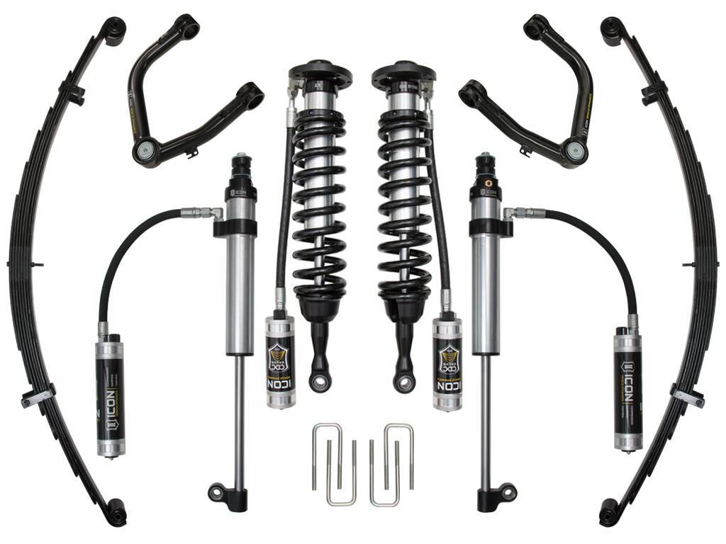 ICON Vehicle Dynamics 2007-2021 Toyota Tundra suspension systems are designed with maximum performance and the serious driver in mind. Throughout the development of these systems ICON engineers primary focus is to increase wheel travel and damping ability, which translates into outstanding vehicle control and ride quality both on and off-road. This Stage 9 system goes a step further in delivering ICON performance to the Tundra with the addition of rear suspension components that include an ICON RXT multi-rate leaf spring and a unique RXT-specific 2.5 Series shock.;The Stage 9 system includes vehicle-specific tuned 2.5 Series coilover shocks equipped with ICON's CDC (Compression Damping Control) Valve. The easy-to-adjust CDC Valve allows for end-user compression changes to provide optimal ride quality across all types of terrain and vehicle cargo configurations. In addition, the coilovers feature a remote reservoir for exceptional cooling properties, ICON-engineered Eibach coil springs for superior vehicle “feel†through the range of travel, and are height adjustable from 1-3†allowing the use of larger, more aggressive wheel and tire combinations. Used in conjunction with the included ICON upper control arm, these coilovers increase droop travel to the front suspension. To further increase the ride quality of the truck and gain additional droop travel, the ICON RXT multi-rate leaf springs are added to the rear. Designed with an additional leaf (included with kit) that can be exchanged or added to the pack to yield additional spring rate, this leaf spring is perfect for drivers seeking improved rear ride quality in an “unloaded†vehicle as well as those that are have outfitted their trucks with a significant amount of weight in the form of a bed rack, roof top tent, spare tires, parts, or other additions. To compliment this increase in rear wheel travel the Stage 9 system includes a unique 2.5 Aluminum Series CDC remote reservoir shock that features a side-mount eyelet making it shorter in collapsed length, longer at extension, and still fit in the factory mounting location. This shock also features ICON's CDC technology for simple compression adjustability, and a large ten-inch remote reservoir was added to aid in heat dissipation and resist shock fade during spirited driving.;This system features billet aluminum upper control arms with ICON's patented Delta Joint. The Delta Joint is a heavy-duty high angle ball joint that combines the durability of a ball joint with the performance characteristics of a traditional uniball. While the industry standard uniball does a great job of allowing the control arms of a vehicle to articulate with little bind, they do have an inherent weakness that leaves more to be desired when used in a daily driven application - exposure to the elements. The Delta Joint features a zinc plated housing providing the first layer of corrosion resistance, while a tough grease seal keeps potentially harmful elements out of the inner workings of the joint. Metal on metal construction and a greaseable design increase the longevity of the Delta Joint while at the same time allowing for noise-free operation. What makes the Delta Joint unique is that it brings the best of both worlds to ICON upper control arms with features that make it more robust than a uniball, and at the same time capable of greater angularity than a typical ball joint.