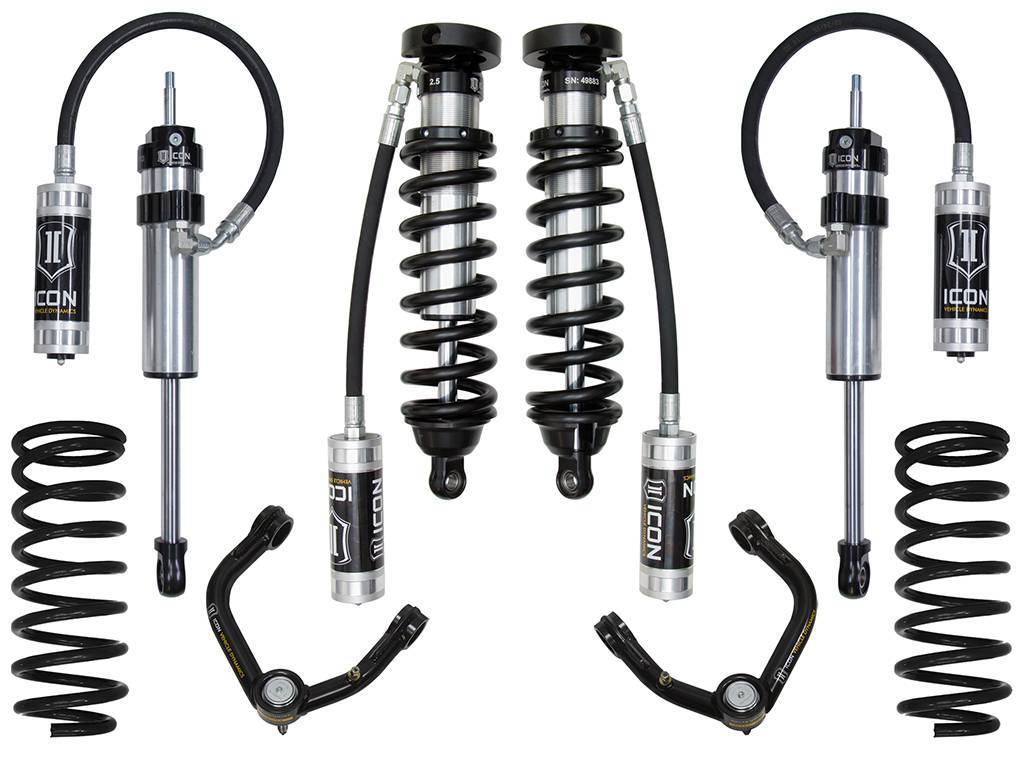 OEM Wheels & Tires Fitment: Yes Recommended Aftermarket Wheels: ICON Alloys | 17x8.5" w/ 4.75” Backspace / 0mm Offset Recommended Aftermarket Wheels: ICON Alloys | 18x9" w/ 5.00” Backspace / 0mm Offset Recommended Aftermarket Wheels: ICON Alloys | 20x9" w/ 5.00” Backspace / 0mm Offset Recommended Aftermarket Tires: 33" x 11.50" (Larger tires may fit but fender trimming and modifications will be required.) APPLICATION NOTE #35: REMOTE RESERVOIR MOUNTING BRACKETS MAY INTERFERE WITH AFTERMARKET BUMPER MOUNTS / WINDSHIELD WASHER BOTTLES. APPLICATION NOTE #47: 700LB/IN EXPEDITION COIL AVAILABLE FOR HEAVIER EQUIPPED VEHICLES APPLICATION NOTE #55: SHOCKS ARE FULLY SERVICEABLE. COILOVER HEIGHTS INDICATED ARE FOR A STOCK EQUIPPED VEHICLE APPLICATION NOTE #111: BUMP STOP SPACER KIT AVAILABLE THAT CAN BE INSTALLED TO INCREASE THREADS SHOWING BEYOND MAX RECOMMENDATION. Ships in multiple boxes
