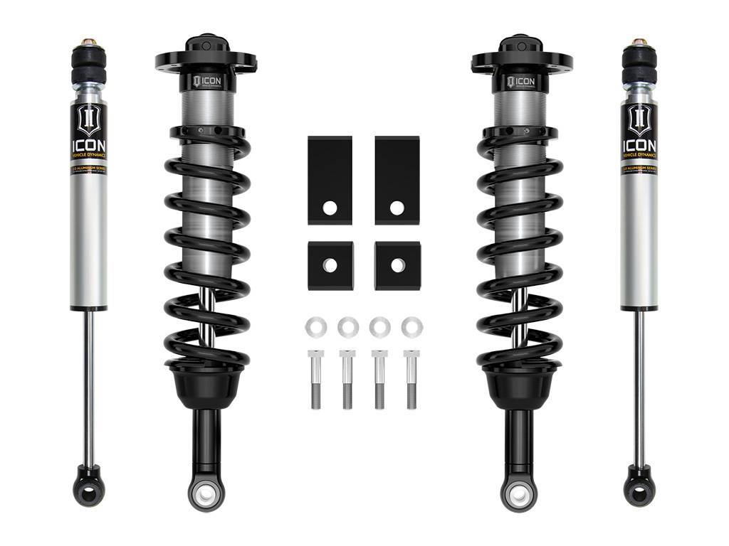 The ICON Vehicle Dynamics Stage 3 complete suspension system for the 2022-2023 Toyota Tundra is our most basic system that features complete ICON threaded-body V.S. 2.5 Series Coilovers in the front, This system offers improved on- and off-road performance as well as adjustable front-end lift and leveling for a proper stance and fitment of up to 35" tires. To compliment the internal reservoir coilover shocks a sway bar drop kit for the front of the truck is included along with our proven 2.0 nitrogen charged monotube shock with internal reservoir for the rear.;This Stage 3 system features the 2022-2023 Toyota Tundra VS 2.5 Series internal reservoir front coilovers. These adjustable coilovers allow up to 1.25-2.25†of lift height adjustability over stock when using the OE upper control arms, allowing the use of larger, more aggressive wheel and tire combinations. ICONs Vehicle-specific shock length and valving along with the larger 2.5†shock body and increased piston area over stock components yield the maximum travel possible (up to 40% increase over stock) along with superior ride quality and suspension performance both on- and off-road.;The included sway bar drop brackets help minimize sway bar link bind through the suspension travel range. This helps the suspension move more freely and allows for the full range of wheel travel without overstressing any OE components.;Rounding out the Stage 3 suspension system are V.S. 2.0 Aluminum Series rear shocks specially tailored for the 2022-2023 Tundra. The 2.0 Aluminum Series shocks are a high-quality upgrade for the everyday street driver and weekend warrior looking for improved on and off-road performance. Their pairing with the ICON V.S. 2.5 Series front coilovers results in balanced vehicle control from front to rear and an excellent overall driving experience for your Tundra.