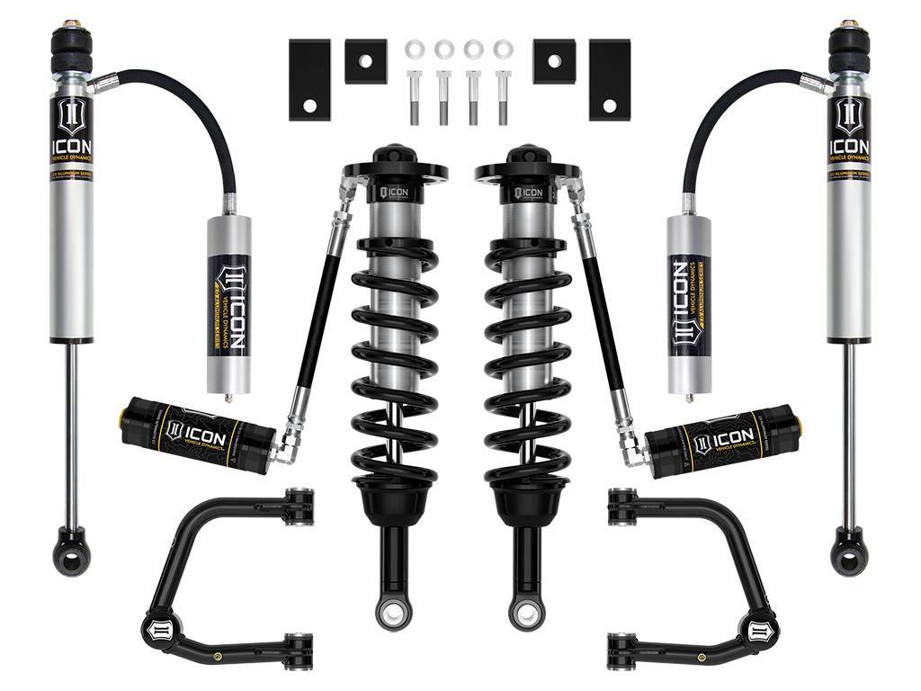 The ICON Vehicle Dynamics Stage 6 complete suspension system for the 2022-2023 Toyota Tundra builds upon the Stage 5 system with the upgrade of the 2.5 Series front coilovers to remote reservoir versions. This system offers improved on- and off-road performance, with greater front and rear shock heat dissipation, as well as improved alignment specs and increased front-end lift height range for a proper stance and fitment of up to 35" tires. To compliment the remote reservoir coilover shock and tubular control arm combo, a sway bar drop kit for the front of the truck is included along with our proven 2.0 nitrogen charged monotube shocks with remote reservoirs for the rear.;This Stage 6 system features the 2022-2023 Toyota Tundra VS 2.5 Series remote reservoir front coilovers. These adjustable coilovers allow up to 2-3.5†of lift height adjustability over stock when using the ICON tubular front upper control arms, allowing the use of larger, more aggressive wheel and tire combinations. ICONs Vehicle-specific shock length and valving along with the larger 2.5†shock body and increased piston area over stock components yield the maximum travel possible (up to 40% increase over stock) along with superior ride quality and suspension performance both on- and off-road. Remote reservoirs greatly increase shock oil volume and heat dissipation surface area to resist overheating and cavitation under hard use, which can lead to damper fade.;The included ICON tubular upper control arm kit is designed to improve the overall performance of the new 2022-2023 Toyota Tundra with corrected front-end geometry, built in additional caster, and improved suspension component clearance. Additionally, replacing the OE ball joint with the all-new, serviceable, and rebuildable ICON Delta Joint PRO allows for full bump and droop travel of the front suspension while eliminating bind.;The included sway bar drop brackets help minimize sway bar link bind through the suspension travel range. This helps the suspension move more freely and allows for the full range of wheel travel without overstressing any OE components.;Rounding out the Stage 6 suspension system are V.S. 2.0 Aluminum Series rear remote reservoir shocks specially tailored for the 2022-2023 Tundra. The 2.0 Aluminum Series shocks are a high-quality upgrade for the everyday street driver and weekend warrior looking for improved on and off-road performance. Remote reservoirs ensure optimum performance by increasing the duration of consistent damping regardless of situation, keeping the shocks at a cooler operating temperature during heavy use. Their pairing with the ICON V.S. 2.5 Series front coilovers results in balanced vehicle control from front to rear and an excellent overall driving experience for your Tundra.