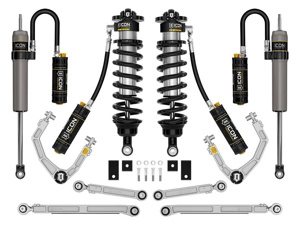 The ICON Vehicle Dynamics Stage 1 3.0 complete suspension system for the 2022-2023 Toyota Tundra builds upon the Stage 10 2.5 suspension system with the upgrade to 3.0 Series front coilovers. To compliment the 3.0 Series coilover shocks, 2.5 Aluminum Series CDCV rear remote reservoir shocks are included along with billet aluminum front upper control arms and a billet rear upper/lower link combo, and a front sway bar drop kit. This system offers improved on- and off-road performance with adjustable compression damping, as well as improved alignment specs and increased front-end lift height range for a proper stance and fitment of up to 35" tires.;This Stage 1 system features the 2022-2023 Toyota Tundra VS 3.0 Series remote reservoir front coilovers equipped with CDC Valves. These adjustable coilovers allow up to 1.25-3.25†of lift height adjustability over stock when using the ICON billet front upper control arms, allowing the use of larger, more aggressive wheel and tire combinations. The larger 3.0 Series shocks offer 50% more piston surface area in the ride zone of the shock's travel, and 100% in the “Bump Zoneâ€, compared to 2.5 Series shocks. The multi-stage hydraulic Bump Zone exponentially increases bottom-out resistance as the shock travels through the last 40% of travel, keeping vehicle dynamics in check during those hard hits or unexpected obstacles. The included ICON CDC Valves are externally adjustable valves that restricts oil flow into the reservoir which creates 10 levels of compression damping force ranges. Additionally, ICONs Vehicle-specific shock length yields the maximum travel possible (up to 40% increase over stock), all translating into increased stability and vehicle control at the extremes of off-road use, with benefits also making themselves apparent in on-road driving conditions.;The included ICON billet aluminum upper control arm kit is designed to improve the overall performance of the new 2022-2023 Toyota Tundra with corrected front-end geometry, increased on-vehicle camber and caster adjustment, and improved suspension component clearance. Additionally, replacing the OE ball joint with the all-new, serviceable, and rebuildable ICON Delta Joint PRO allows for full bump and droop travel of the front suspension while eliminating bind.;The included sway bar drop brackets help minimize sway bar link bind through the suspension travel range. This helps the suspension move more freely and allows for the full range of wheel travel without overstressing any OE components.;ICON billet aluminum adjustable rear upper and lower links are made from CNC machined 6061 aluminum and anodized for corrosion resistance. These link arm kits feature PTFE-lined FK rod ends for increased suspension articulation, reduced deflection, and on-vehicle link arm length adjustability using ICONs double adjuster system. Additionally, multi durometer bushings are installed that allow for noise free operation and maximum angularity without the need for periodic greasing and/or other maintenance.;Rounding out the Stage 1 suspension system are 2.5 Aluminum Series rear remote reservoir shocks specially tailored for the 2022-2023 Tundra. The 2.5 Aluminum Series shocks larger diameter offers outstanding performance off-road and a smooth ride on the street. Remote reservoirs ensure optimum performance by increasing the duration of consistent damping regardless of situation, keeping the shocks at a cooler operating temperature during heavy use. They also feature a unique internal Bump Zone that when used creates an additional 20% of damping force to help better control hard bottom outs. Also equipped with CDC Valves, these offer 10 settings of compression damping adjustment from soft to hard. Their pairing with the ICON V.S. 3.0 Series CDCV front coilovers results in balanced vehicle control from front to rear and an excellent overall driving experience for your Tundra.