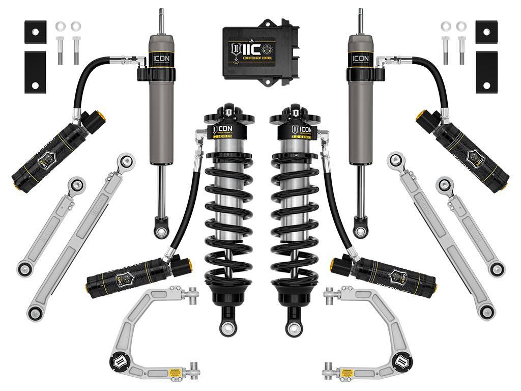 The ICON Vehicle Dynamics Stage 4 3.0 complete suspension system for the 2022-2023 Toyota Tundra builds upon the Stage 1 3.0 suspension system with the upgrade to CDEV and ICON Intelligent control (IIC) for in vehicle, active compression damping adjustment. To compliment the 3.0 Series coilover shocks, 2.5 Aluminum Series CDEV rear remote reservoir shocks are included along with billet aluminum front upper control arms and a billet rear upper/lower link combo, and a front sway bar drop kit. This system offers improved on- and off-road performance with adjustable compression damping, as well as improved alignment specs and increased front-end lift height range for a proper stance and fitment of up to 35" tires.;This Stage 4 system features the 2022-2023 Toyota Tundra VS 3.0 Series remote reservoir front coilovers equipped with CDE Valves. These adjustable coilovers allow up to 1.25-3.25†of lift height adjustability over stock when using the ICON billet front upper control arms, allowing the use of larger, more aggressive wheel and tire combinations. The larger 3.0 Series shocks offer 50% more piston surface area in the ride zone of the shock's travel, and 100% in the “Bump Zoneâ€, compared to 2.5 Series shocks. The multi-stage hydraulic Bump Zone exponentially increases bottom-out resistance as the shock travels through the last 40% of travel, keeping vehicle dynamics in check during those hard hits or unexpected obstacles. Focus on driving and let ICON Intelligent Control (IIC) read the terrain and make near-instant adjustments via the Compression Damping Electronic Valve (CDEV) at each individual shock. Control the system wirelessly through the IIC app on your phone and once configured the system functions without driver input. Additionally, ICONs Vehicle-specific shock length yields the maximum travel possible (up to 40% increase over stock), all translating into increased stability and vehicle control at the extremes of off-road use, with benefits also making themselves apparent in on-road driving conditions.;The included ICON billet aluminum upper control arm kit is designed to improve the overall performance of the new 2022-2023 Toyota Tundra with corrected front-end geometry, increased on-vehicle camber and caster adjustment, and improved suspension component clearance. Additionally, replacing the OE ball joint with the all-new, serviceable, and rebuildable ICON Delta Joint PRO allows for full bump and droop travel of the front suspension while eliminating bind.;The included sway bar drop brackets help minimize sway bar link bind through the suspension travel range. This helps the suspension move more freely and allows for the full range of wheel travel without overstressing any OE components.;ICON billet aluminum adjustable rear upper and lower links are made from CNC machined 6061 aluminum and anodized for corrosion resistance. These link arm kits feature PTFE-lined FK rod ends for increased suspension articulation, reduced deflection, and on-vehicle link arm length adjustability using ICONs double adjuster system. Additionally, multi durometer bushings are installed that allow for noise free operation and maximum angularity without the need for periodic greasing and/or other maintenance.;Rounding out the Stage 4 suspension system are 2.5 Aluminum Series rear remote reservoir shocks specially tailored for the 2022-2023 Tundra. The 2.5 Aluminum Series shocks larger diameter offers outstanding performance off-road and a smooth ride on the street. Remote reservoirs ensure optimum performance by increasing the duration of consistent damping regardless of situation, keeping the shocks at a cooler operating temperature during heavy use. They also feature a unique internal Bump Zone that when used creates an additional 20% of damping force to help better control hard bottom outs. Also equipped with CDE Valves, these offer active, on the fly compression damping adjustment from soft to hard. Their pairing with the ICON V.S. 3.0 Series CDEV front coilovers results in balanced vehicle control from front to rear and an excellent overall driving experience for your Tundra.