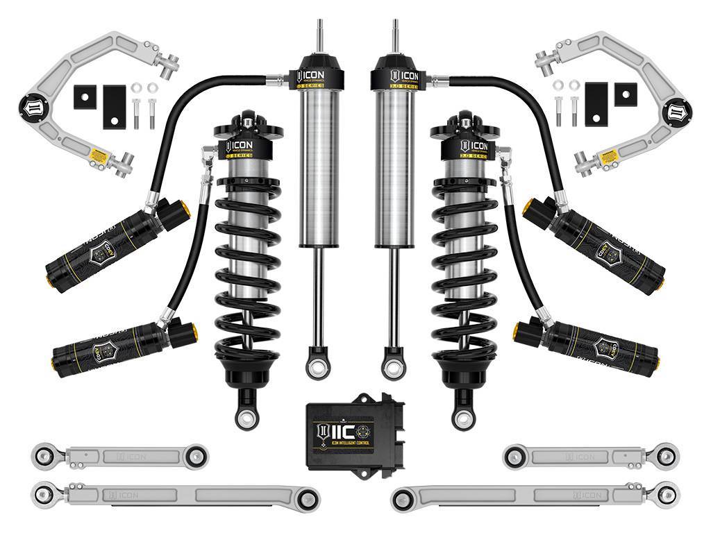 The ICON Vehicle Dynamics Stage 5 3.0 complete suspension system for the 2022-2023 Toyota Tundra builds upon the Stage 4 3.0 suspension system with the upgrade to 3.0 Series rear remote reservoir shocks with CDEV. To compliment the 3.0 Series rear remote reservoir shocks, 3.0 Series CDEV front coilovers are included along with billet front upper control arms, a billet rear upper/lower link combo, and a front sway bar drop kit. This system offers improved on- and off-road performance with adjustable compression damping, as well as improved alignment specs and increased front-end lift height range for a proper stance and fitment of up to 35" tires.;This Stage 5 system features the 2022-2023 Toyota Tundra VS 3.0 Series remote reservoir front coilovers equipped with CDE Valves. These adjustable coilovers allow up to 1.25-3.25†of lift height adjustability over stock when using the ICON billet front upper control arms, allowing the use of larger, more aggressive wheel and tire combinations. The larger 3.0 Series shocks offer 50% more piston surface area in the ride zone of the shock's travel, and 100% in the “Bump Zoneâ€, compared to 2.5 Series shocks. The multi-stage hydraulic Bump Zone exponentially increases bottom-out resistance as the shock travels through the last 40% of travel, keeping vehicle dynamics in check during those hard hits or unexpected obstacles. Focus on driving and let ICON Intelligent Control (IIC) read the terrain and make near-instant adjustments via the Compression Damping Electronic Valve (CDEV) at each individual shock. Control the system wirelessly through the IIC app on your phone and once configured the system functions without driver input. Additionally, ICONs Vehicle-specific shock length yields the maximum travel possible (up to 40% increase over stock), all translating into increased stability and vehicle control at the extremes of off-road use, with benefits also making themselves apparent in on-road driving conditions.;The included ICON billet aluminum upper control arm kit is designed to improve the overall performance of the new 2022-2023 Toyota Tundra with corrected front-end geometry, increased on-vehicle camber and caster adjustment, and improved suspension component clearance. Additionally, replacing the OE ball joint with the all-new, serviceable, and rebuildable ICON Delta Joint PRO allows for full bump and droop travel of the front suspension while eliminating bind.;The included sway bar drop brackets help minimize sway bar link bind through the suspension travel range. This helps the suspension move more freely and allows for the full range of wheel travel without overstressing any OE components.;ICON billet aluminum adjustable rear upper and lower links are made from CNC machined 6061 aluminum and anodized for corrosion resistance. These link arm kits feature PTFE-lined FK rod ends for increased suspension articulation, reduced deflection, and on-vehicle link arm length adjustability using ICONs double adjuster system. Additionally, multi durometer bushings are installed that allow for noise free operation and maximum angularity without the need for periodic greasing and/or other maintenance.;Rounding out the Stage 5 suspension system are 3.0 Series rear remote reservoir shocks specially tailored for the 2022-2023 Tundra. 3.0 Series shocks boast 50% more piston surface area compared to 2.5 Series shocks, offering outstanding performance off-road and a smooth ride on the street. Increased internal oil volume and more external surface area compared to 2.5 Series Shocks, plus their remote reservoirs, offer even greater heat dissipation and resistance to shock fade under hard use. Also equipped with CDE Valves, these offer active, on the fly compression damping adjustment from soft to hard. Their pairing with the ICON V.S. 3.0 Series CDEV front coilovers results in balanced vehicle control from front to rear and an excellent overall driving experience for your Tundra.