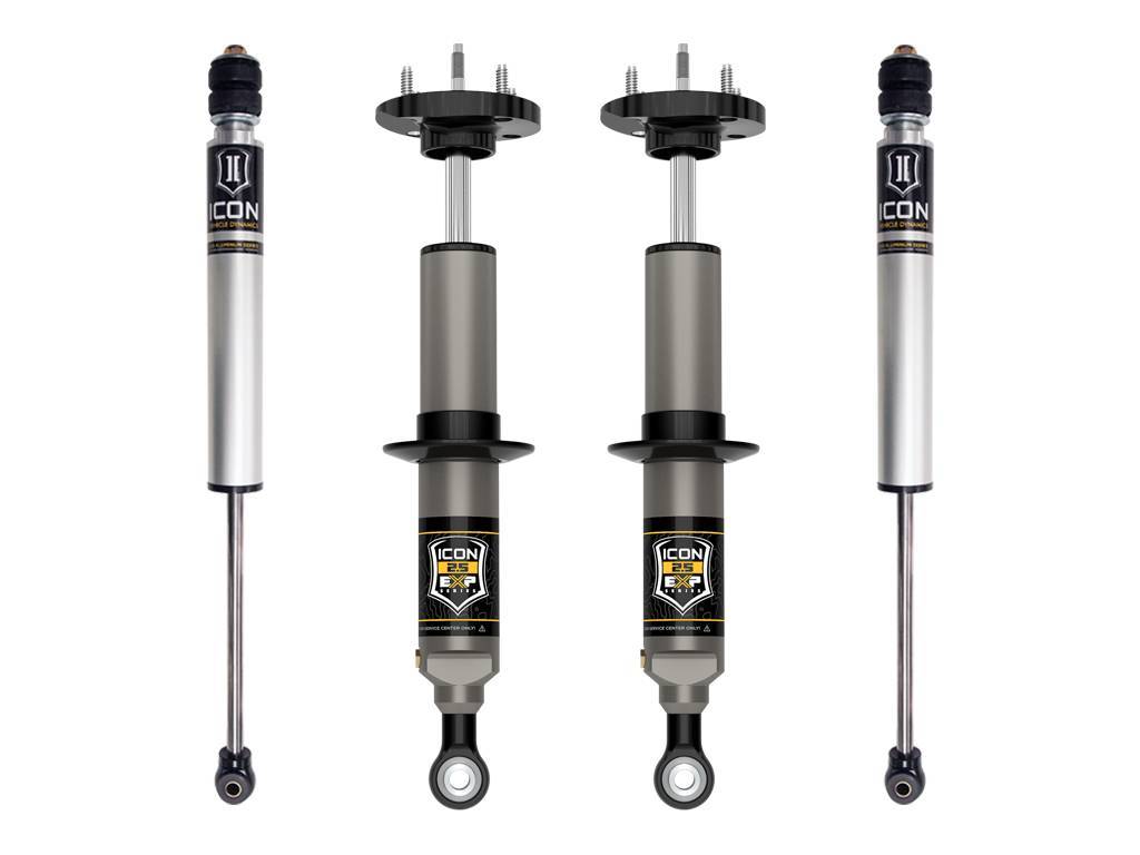 The ICON Vehicle Dynamics Stage 1 EXP suspension system for the 2007-2021 Toyota Tundra represents our entry level performance suspension system providing improved on- and off-road performance as well as front-end lift and leveling for a proper stance and fitment of up to 35" tires. This system features the innovative new 2.5 EXP series coilover shocks along with our proven 2.0 Aluminum Series nitrogen charged monotube shocks for the rear.;This Stage 1 system features the 2007-2021 Toyota Tundra EXP Series front shock absorbers that combine the performance of a fully rebuildable 2.5-inch diameter premium shock absorber with the convenience and cost-benefits of re-using the Tacomas factory coil spring and other components. EXP bridges the gap between spacer lifts and threaded bodied coilovers providing 0-2.25†of suspension lift, custom-tuned performance and maximum travel all in an economical package.;Rounding out the Stage 1 EXP suspension system are V.S. 2.0 Aluminum Series rear shocks specially tailored for the 2007-2021 Toyota Tundra. The 2.0 Aluminum Series shocks are a high-quality upgrade for the everyday street driver and weekend warrior looking for improved on and off-road performance. Their pairing with the ICON 2.5 EXP Series front coilovers results in balanced vehicle control from front to rear and an excellent overall driving experience for your Tundra.