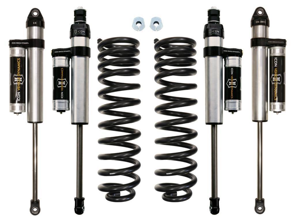 The ICON 2.5†suspension system is a great way to level your 4WD 2005-2016 Ford F250/350 Super Duty while improving ride quality and performance. This Stage 3 system is great for towing, rough construction site terrains, and country dirt roads all while keeping a smooth highway feel. ICON's Stage 3 System is comprised of dual rate coil springs, alignment cams for adding caster, and ICON 2.5 Aluminum Series piggyback reservoir shocks front and rear. ICON 2.5" reservoir shocks ensure optimum performance by increasing the duration of consistent damping regardless of situation, keeping the shocks at a cooler operating temperature during heavy use. With the endless hours ICON has spent testing and tuning our suspension components and shocks as a complete package, you can rest assured you have the best suspension solution on the market.;For F-250 applications, a 4" block can be used in place of your factory 2" block, in turn leveling the truck from front to rear, allowing use of ICON Rear Shocks.