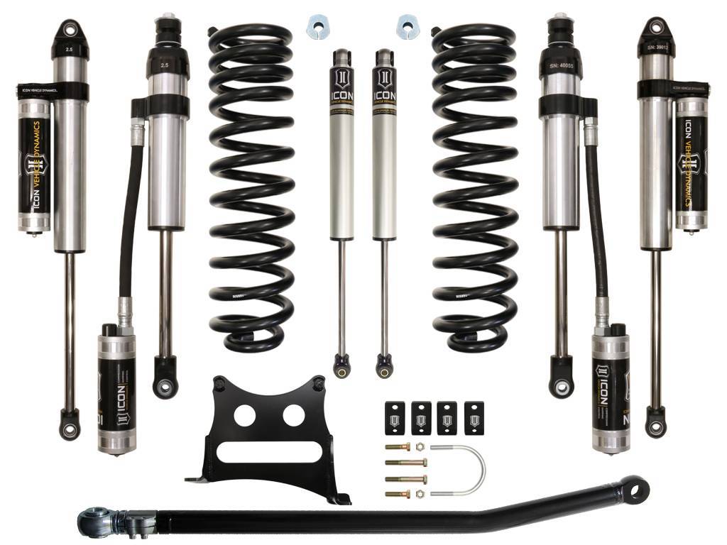 The ICON 2.5†suspension system is a great way to level your 4WD 2005-2016 Ford F250/350 Super Duty while improving ride quality and performance. This Stage 5 system is great for towing, rough construction site terrains, and country dirt roads all while keeping a smooth highway feel. Also included in this stage is ICON's CDC Valve front to back for those desiring an easy way to tune the ride externally with 10 settings from soft to hard. ICON's Stage 5 System is comprised of dual rate coil springs, alignment cams for adding caster, adjustable track bar w/ bearing, dual steering stabilizer kit with ICON 2.0 Aluminum Series stabilizers, and ICON 2.5 Aluminum Series remote reservoir shocks front and rear w/ CDCV. ICON 2.5" reservoir shocks ensure optimum performance by increasing the duration of consistent damping regardless of situation, keeping the shocks at a cooler operating temperature during heavy use. With the endless hours ICON has spent testing and tuning our suspension components and shocks as a complete package, you can rest assured you have the best suspension solution on the market.;For F-250 applications, a 4" block can be used in place of your factory 2" block, in turn leveling the truck from front to rear, allowing use of ICON rear shocks.