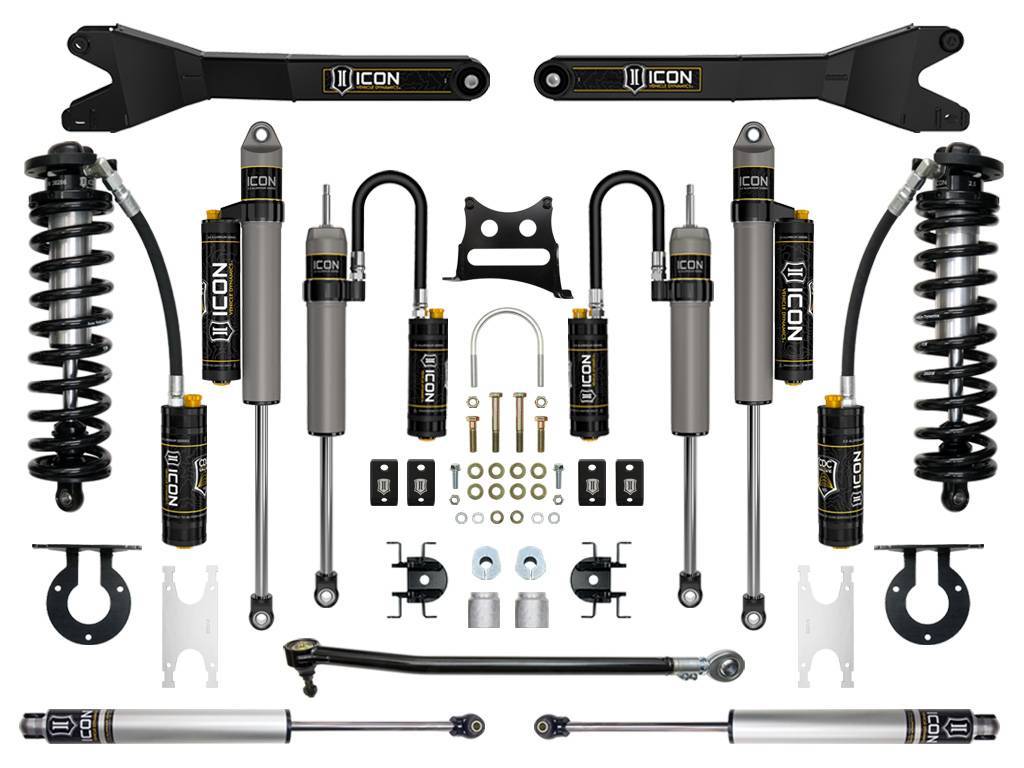 ICON's 2.5 VS Series Remote Reservoir Bolt-In Coilover Conversion Kit will add a new level of performance and adjustability to 2017-2022 F-250 and F-350 trucks. The advantage of utilizing a coilover conversion kit is that they have been designed to increase the overall damping ability of the vehicle while at the same time allowing for user-defined ride height adjustment. The 2.5" Remote Reservoir Coilover featured in these kits is based off of ICONs 2.5 Series shock line - meaning that features like Eibach coil springs, FK Rod End bearings, and vehicle-specific valving come standard. Quality machined components and a fully serviceable design make for a product that will stand the test of time, yet retain the ability to be rebuilt or re-valved as necessary.;This Stage 6 system sees the inclusion of the ICON Vehicle Dynamics Ford Super Duty Radius Arm System that feature a sealed pivot bushing that minimizes road feedback and ensures a long life and quiet operation. Additionally, their fabricated, fully boxed design ensures strength and utilizes a profile optimized for tire clearance at full steering lock, making a 37†tall tire clear without coming in contact with the radius arm.