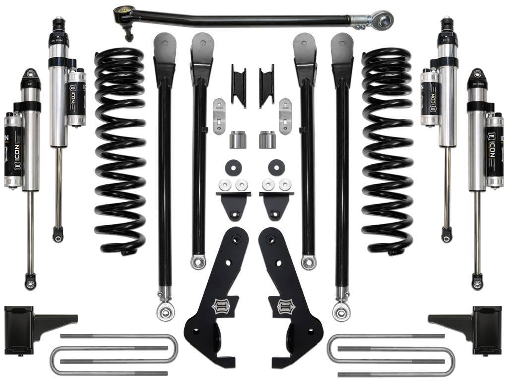 The Stage 4 system sees the inclusion of the ICON Vehicle Dynamics Ford Super Duty 4-Link kit, which further improves performance by eliminating suspension bind commonly experienced with factory radius arms during articulation. This “freeing up†of the front end and the ability of the 4-Link Kit to maintain positive caster through the range of travel equates to an unparalleled ride quality in all conditions. With the endless hours ICON has spent testing and tuning our suspension components and shocks as a complete package, you can rest assured knowing that you have the best suspension solution on the market.;This ICON Vehicle Dynamics 4.5†suspension system is a great way to lift your 4WD 2017-2019 Ford F250/350 Super Duty while drastically improving ride quality and performance. The Stage 4 system is perfect for on-road and off-road use including towing, job site duty and hardcore off-road adventure. ICON's Stage 4 System is comprised of dual rate coil springs, adjustable track bar, 5" block kit, and ICON CDC Valve 2.5 Aluminum Series front and rear piggyback reservoir shocks.