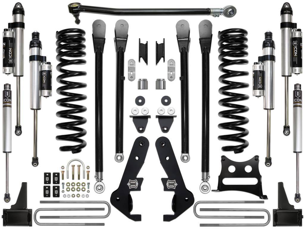 This ICON Vehicle Dynamics 4.5†suspension system is a great way to lift your 4WD 2017-2019 Ford F250/350 Super Duty while drastically improving ride quality and performance. The Stage 5 system is perfect for on-road and off-road use including towing, job site duty and hardcore off-road adventure. ICON's Stage 5 System is comprised of dual rate coil springs, adjustable track bar, 5" block kit, ICON CDC Valve 2.5 Aluminum Series front and rear piggyback reservoir shocks and dual opposing 2.0 Aluminum Series steering stabilizer kit for the ultimate in on-road comfort and off-road performance.;The Stage 5 system sees the inclusion of the ICON Vehicle Dynamics Ford Super Duty 4-Link kit, which further improves performance by eliminating suspension bind commonly experienced with factory radius arms during articulation. This “freeing up†of the front end and the ability of the 4-Link Kit to maintain positive caster through the range of travel equates to an unparalleled ride quality in all conditions. With the endless hours ICON has spent testing and tuning our suspension components and shocks as a complete package, you can rest assured knowing that you have the best suspension solution on the market.