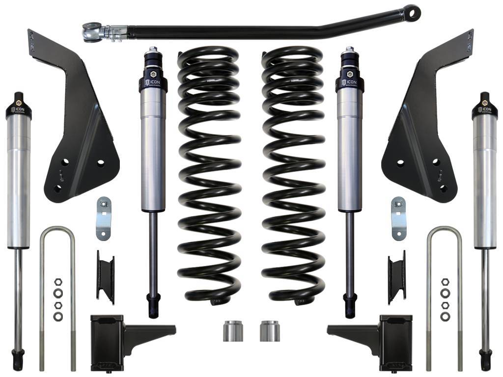 This 4.5" System for the 2008-2010 Super Duty is one of the best riding suspension systems ICON has ever developed. This system has been engineered using the highest quality materials and components. The dual rate front coil springs combined with our ICON 2.5 Aluminum Series shocks give these trucks the performance they so desperately need. This system comes complete with front coils, shocks, radius arm drop down brackets, rear blocks, U-bolts, and our patented adjustable track bar giving the front end of these trucks perfect track alignment.