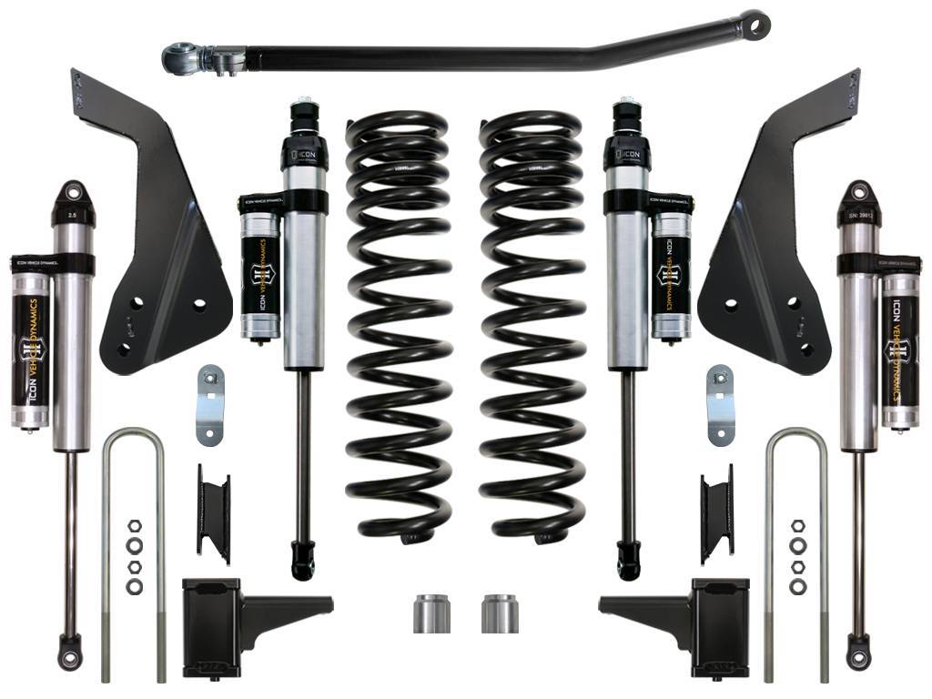 This 4.5" System for the 2008-2010 Super Duty is one of the best riding suspension systems ICON has ever developed. This system has been engineered using the highest quality materials and components. The dual rate front coil springs combined with our ICON 2.5 Aluminum Series shocks give these trucks the performance they so desperately need. This system comes complete with front coils, shocks, radius arm drop down brackets, rear blocks, U-bolts, and our patented adjustable track bar with upgraded bearing giving the front end of these trucks perfect track alignment. The Stage 3 system also upgrades the front and rear shocks to our 2.5 Aluminum Series piggyback reservoir shocks for even better ride quality and performance.