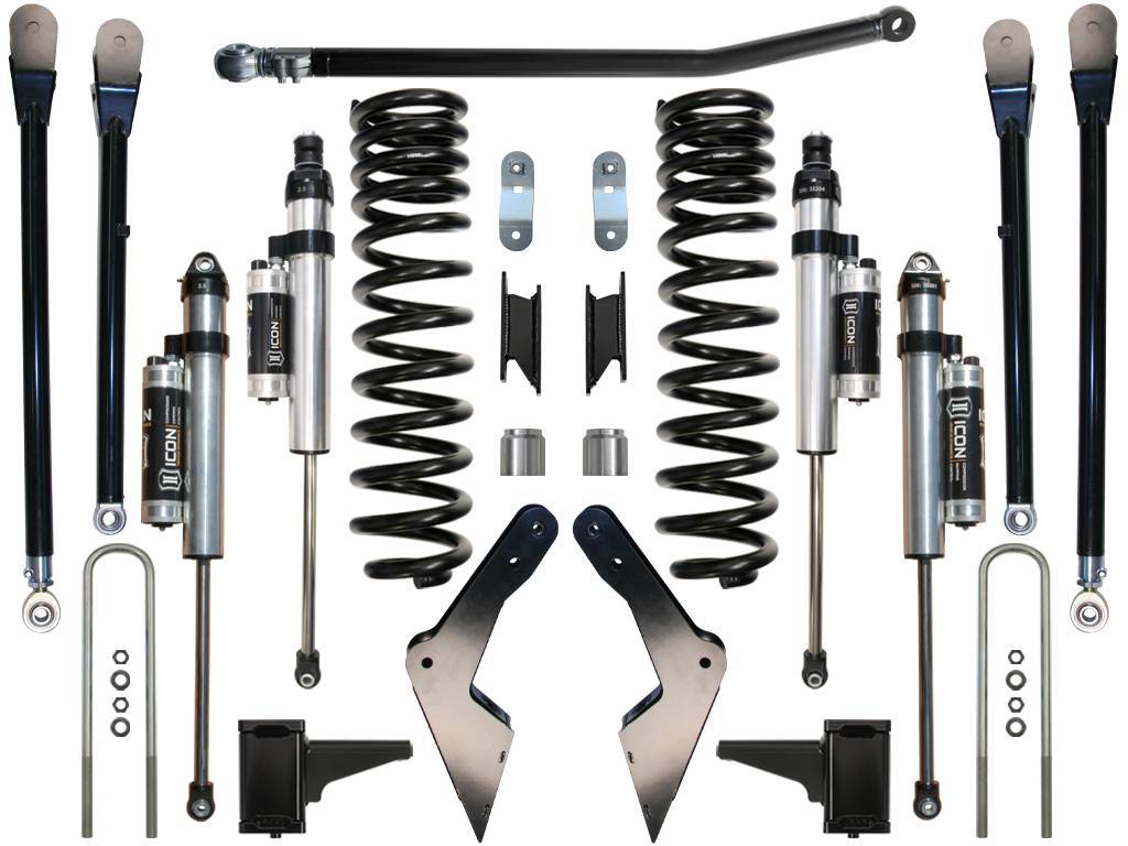 This 4.5" System for the 2008-2010 Super Duty is one the best riding suspension systems ICON has ever developed. This system has been engineered using the highest quality materials and components. The dual rate front coil springs combined with our ICON 2.5 Aluminum Series CDCV shocks give these trucks the performance they so desperately need. This system comes complete with front coils, shocks, radius arm drop down brackets, rear blocks and U-bolts and our patented adjustable track bar giving the front end of these trucks perfect track alignment. The Stage 4 system also includes shocks that feature the ICON Compression Damping Control Valve (CDCV) and our 4-Link kit for the ultimate in shock technology and suspension technology.