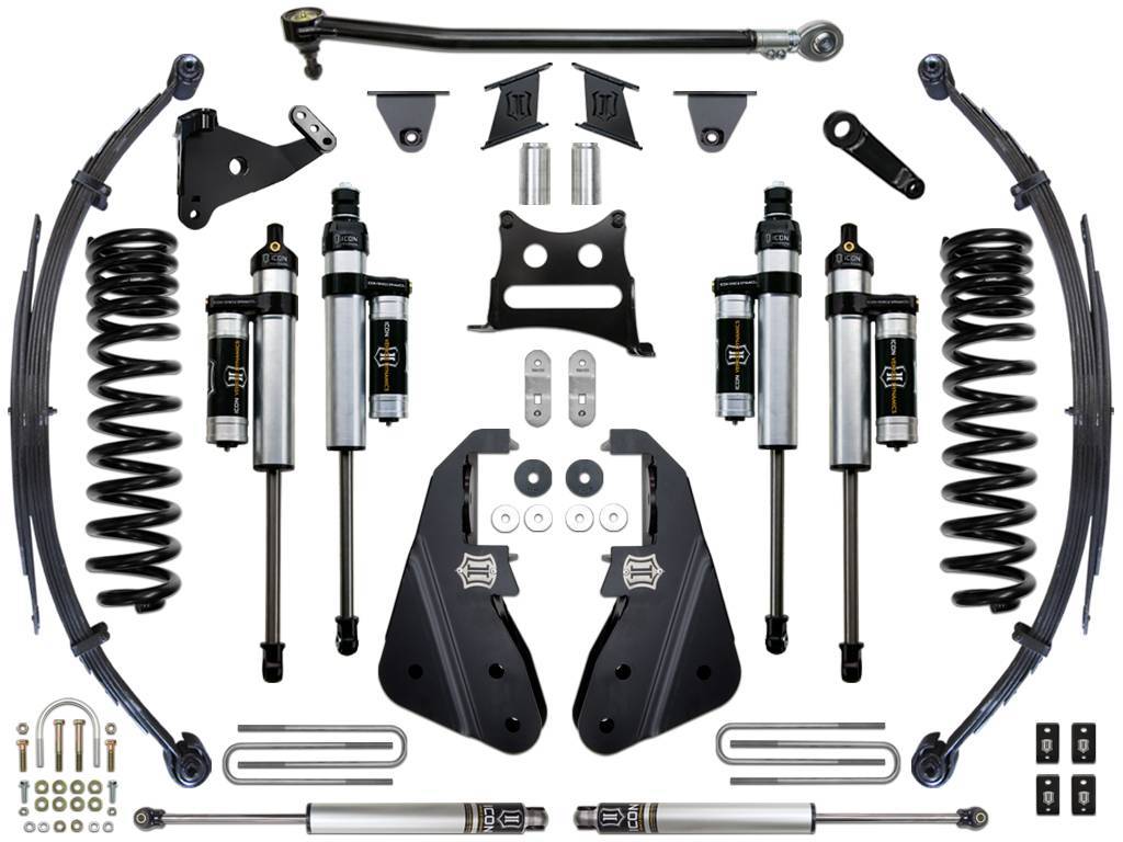 This ICON Vehicle Dynamics 7†suspension system is a great way to lift your 4WD 2017-2022 Ford F-250/F-350 Super Duty while drastically improving ride quality and performance. This suspension system is perfect for on-road and off-road use including towing, job site duty, and spirited off-road adventure. ICON's 7" Stage 3 System is comprised of dual rate coil springs, progressive leaf springs, radius arm drop brackets, adjustable track bar, dual opposing steering stabilizer kit, ICON 2.5 Aluminum Series piggyback reservoir front and rear shocks, plus all of the necessary hardware for installation. With the endless hours ICON has spent testing and tuning our suspension components and shocks as a complete package, you can rest assured you have the best suspension solution on the market.