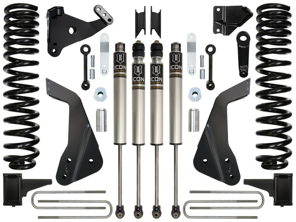 ICON Vehicle Dynamics is an industry leader when it comes to Ford Super Duty performance. Our engineers have spent countless hours under these trucks and behind the wheel developing some of the most refined suspension systems available. Increasing wheel travel and ride comfort is standard operating procedure at ICON, but our engineers aimed high to produce a suspension solution that also maintained the Super Dutys outstanding towing capacity. ICONs 7†Suspension System for the 08-10 Super Duty yields enough lift to clear 37†tires while providing excellent ride characteristics across a wide variety of terrain on and off-road. Each component of this suspension system has been specifically engineered to work in union with other ICON parts to extract maximum performance out of the vehicle. Our Stage 1 System is comprised of 7†lift dual rate coil springs, fabricated radius arm drop mounts with brushed stainless badges, track bar drop bracket, bump stop extensions, sway bar links, a forged pitman arm, brake line brackets, rear 6" lift blocks with U-bolts, and 2.0 Aluminum Series smooth body front & rear shocks.