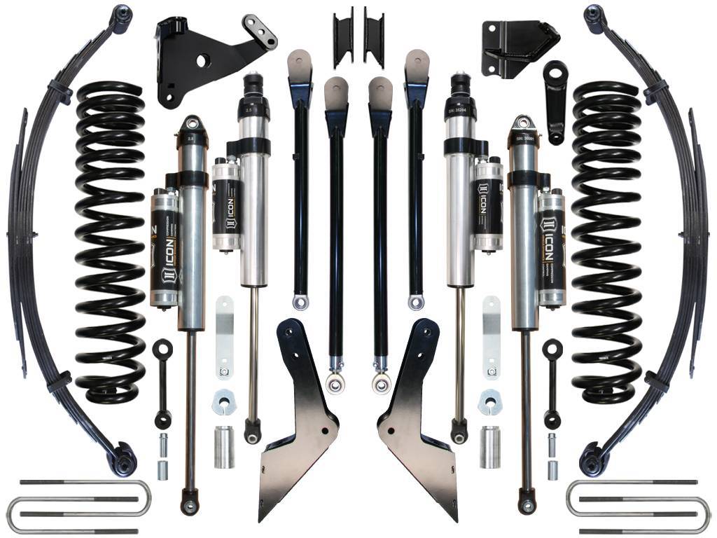 ICON Vehicle Dynamics is an industry leader when it comes to Ford Super Duty performance. Our engineers have spent countless hours under these trucks and behind the wheel developing some of the most refined suspension systems available. Increasing wheel travel and ride comfort is standard operating procedure at ICON, but our engineers aimed high to produce a suspension solution that also maintained the Super Dutys towing capacity. ICONs 7†Suspension System for the 08-10 Super Duty yields enough lift to clear 37†tires while providing excellent ride characteristics across a wide variety of terrain on and off-road. Each component of this suspension system has been specifically engineered to work in union with other ICON parts to extract maximum performance out of the vehicle. Our Stage 5 System is comprised of 7†lift dual rate coil springs, fabricated radius arm drop mounts with brushed stainless badges, track bar drop bracket, bump stop extensions, sway bar links, a forged pitman arm, brake line brackets, rear 5" lift progressive rate leaf springs w/ U-bolts, and 2.5 Aluminum Series piggyback reservoir front & rear shocks. 2.5" reservoir shocks ensure optimum performance by increasing the duration of consistent damping regardless of situation, keeping the shocks at a cooler operating temperature during heavy use. The ICON CDC Valve upgrade is included in this stage for those desiring an easy way to tune the ride externally. ICONs adjustable 4 link system is not only stronger than the factory radius arms, but will enhance performance and improve wheel alignment. These link arms eliminate bind commonly found in the factory radius arms, while increasing the suspension's range of motion.