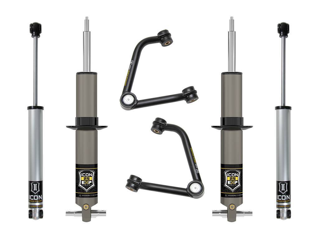 The ICON Vehicle Dynamics Stage 2 EXP complete suspension system for the 2019-2023 GM 1500 pickup builds on ICON's 2.5 EXP Shock Kit with the addition of billet front upper control arms, providing proper alignment at any ride height, improved on- and off-road performance as well as front-end lift and leveling for a proper stance and fitment of up to 35" tires. This system features the innovative new 2.5 EXP series coilover shocks along with our proven 2.0 nitrogen charged monotube shocks with internal reservoirs for the rear.;This Stage 2 system features the 2019-2023 GM 1500 EXP Series front shock absorbers that combine the performance of a fully rebuildable 2.5-inch diameter premium shock absorber with the convenience and cost-benefits of re-using the trucks factory coil spring and other components. EXP bridges the gap between spacer lifts and threaded bodied coilovers, providing suspension lift, custom-tuned performance and maximum travel, all in an economical package.;The included ICON tubular upper control arm kit is designed to improve the overall performance of the new 2019-2023 GM 1500 pickup with corrected front-end geometry, built in additional caster, and improved suspension component clearance. Additionally, replacing the OE ball joint with the serviceable ICON Delta Joint allows for full bump and droop travel of the front suspension while eliminating bind.;Rounding out the Stage 2 EXP suspension system are V.S. 2.0 Aluminum Series rear shocks specially tailored for the 2019-2023 GM 1500. The 2.0 Aluminum Series shocks are a high-quality upgrade for the everyday street driver and weekend warrior looking for improved on and off-road performance. Their pairing with the ICON 2.5 EXP Series front coilovers results in balanced vehicle control from front to rear and an excellent overall driving experience for your Silverado 1500 or Sierra 1500.