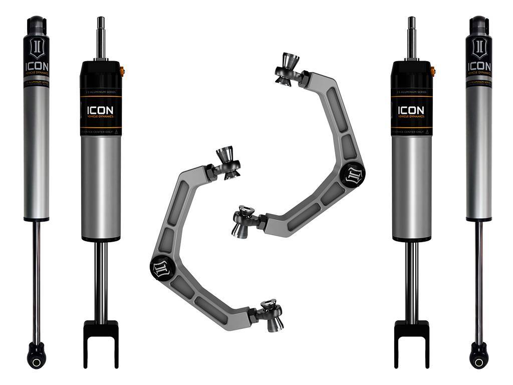 Tougher, stronger and more capable - That's the motto that General Motors used when debuting the all-new fleet of heavy-duty trucks in 2020. ICON Vehicle Dynamics stayed true to GM engineers' thought process with the development of our suspension systems for the 2020-UP GM HD 2500/3500 trucks. Using ICON's holistic engineering philosophy, our R&D team went above and beyond to develop several stages of complete suspension systems that provide varying levels of adjustability, capability, and overall vehicle performance. ICON's Stage 1 system is comprised of V.S. 2.5 Aluminum Series internal reservoir front shocks, 2.0 Aluminum Series internal reservoir rear shocks, and billet aluminum Delta Joint upper control arms. The ICON vehicle specific tuned 2.5" front shocks are the key to attaining optimum ride quality and getting that desired comfort with the 3/4 & 1-ton working capability. Additionally, ICON billet upper control arms add strength, durability, additional caster and camber adjustment, and when paired with extended travel shocks increases wheel travel 2" over the OEM configuration. While driving the construction site or trails to your favorite dirt bike location, ICON wants you to get there in comfort just like your drive to work.;This system features upper control arms with ICON's patented Delta Joint. The Delta Joint is a heavy-duty high angle ball joint that combines the durability of a ball joint with the performance characteristics of a traditional uniball. While the industry standard uniball does a great job of allowing the control arms of a vehicle to articulate with little bind, they do have an inherent weakness that leaves more to be desired when used in a daily driven application - exposure to the elements. The Delta Joint features a zinc plated housing providing the first layer of corrosion resistance, while a tough grease seal keeps potentially harmful elements out of the inner workings of the joint. Metal on metal construction and a greaseable design increase the longevity of the Delta Joint while at the same time allowing for noise-free operation. What makes the Delta Joint unique is that it brings the best of both worlds to ICON upper control arms with features that make it more robust than a uniball, and at the same time capable of greater angularity than a typical ball joint.
