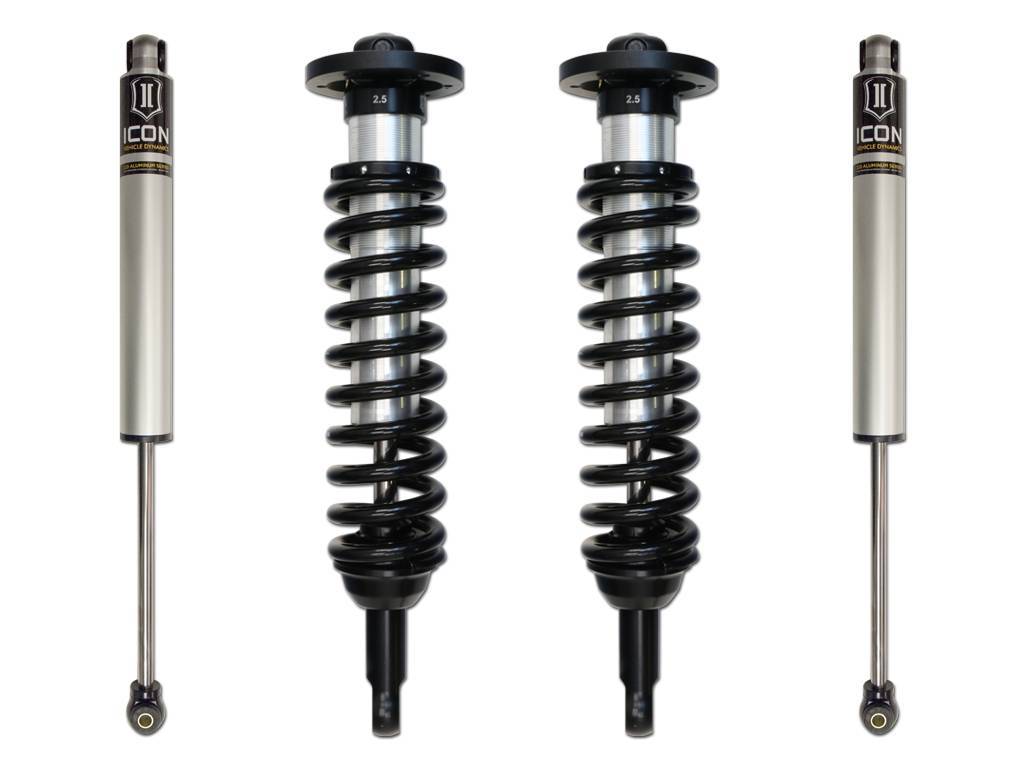 ICON Vehicle Dynamics 2009-2013 Ford F150 4WD suspension systems are designed with maximum performance and the serious driver in mind. ICON engineers primary focus is to increase wheel travel and damping ability, which translates into outstanding vehicle control and ride quality both on and off-road. The Stage 1 system includes vehicle-specific tuned 2.5†coilover shocks featuring an internal reservoir for exceptional cooling properties and ICON-engineered Eibach coil springs for superior vehicle “feel†through the range of travel. These coilovers are also height adjustable from 0-2.63†allowing the use of larger, more aggressive wheel and tire combinations. ICON 2.0 Aluminum Series monotube rear shocks utilize a vehicle-specific valving that balances the performance of the truck from front to rear. The ICON Vehicle Dynamics 2009-2013 F150 4WD Stage 1 suspension system is an excellent choice for those drivers looking to enhance the capabilities of their pickup on the road as well as in the dirt.