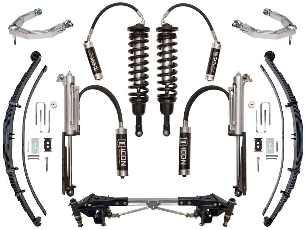 This Stage 4 System combines the unstoppable performance of our Ford Raptor 3.0 Coilover Shock System and fully adjustable Billet Delta Joint Upper Control Arms with the 3.0 RXT complete rear system. The RXT Rear Suspension System includes an all-new RXT 3.0 Rear Bypass shock, RXT Multi-Rate Leaf Spring, along with the ICON Raptor Rear Bump Stop Kit. Installation of this complete system replaces the aforementioned “limiting factors†and completely redefines the potential of this truck.;ICON Raptor 3.0 Coilovers and Billet Upper Control Arms:;The engineers at ICON Vehicle Dynamics took a different approach to position sensitive performance in our 3.0 front coilover shock. Instead of bypassing a small internal piston at the cost of poor control, road holding, and cornering like a traditional internal position sensitive shock, our shock starts with a true 3†main piston that has robust features such as digressive rebound and flutter stack compression. This combination produces outstanding control, great response, and unparalleled ride performance. To achieve even more control for extreme off-road use, we added an additional internal hydraulic system (much like an external mounted hydraulic bump stop) that produces the extreme forces required during the last 40% of travel to achieve maximum bottom out control. These multiple stages of compression and rebound have been tuned independently to maximize overall performance of the Ford SVT Raptor front suspension. For owners who wish to optimize the ride specific to his or her liking, the front coilover shocks are equipped with an external, “Easy to Adjust†Compression Damping Control Valve, that is effective for the entire stroke of the shock. This compression adjustment valve offers you 10 high resolution settings, each bringing a true feel difference from soft to firm.;These trucks were designed with off-road performance in mind but the OE upper arm with ball joint is one of the weak points in the factory Raptor suspension. Unique to no other Raptor upper control arm on the market to have on vehicle adjustable rod ends to allow for easy alignment adjustment in minutes not hours. That means no taking the arms on and off to adjust them you simply loosen the pinch bolts, adjust to your liking, and re-tighten the pinch bolts. The adjustability allows you to retain the factory track width, while improving tire clearance between the tire and back side of the front fender well.;This system features upper control arms with ICON's patented Delta Joint. The Delta Joint is a heavy-duty high angle ball joint that combines the durability of a ball joint with the performance characteristics of a traditional uniball. While the industry standard uniball does a great job of allowing the control arms of a vehicle to articulate with little bind, they do have an inherent weakness that leaves more to be desired when used in a daily driven application - exposure to the elements. The Delta Joint features a zinc plated housing providing the first layer of corrosion resistance, while a tough grease seal keeps potentially harmful elements out of the inner workings of the joint. Metal on metal construction and a greaseable design increase the longevity of the Delta Joint while at the same time allowing for noise-free operation. What makes the Delta Joint unique is that it brings the best of both worlds to ICON upper control arms with features that make it more robust than a uniball, and at the same time capable of greater angularity than a typical ball joint.;ICON Raptor Rear Hydraulic Bump Stop Kit:;The job of the bump stop is to control and limit the final position of the suspension during up-travel. The OE rear bump stop is made of foam rubber, is limited on how much energy it can absorb, and is also a limiting factor in the amount of travel that can be had in the rear of the Raptor. The ICON Raptor Rear Bump Stop Kit utilizes a velocity-sensitive 2.0 hydraulic bump stop that increases the amount of energy absorbed the faster it is hit. With a robust clamshell bracket design and triangulated cross braces, it not only gives a rigid mounting point for the air bump, it helps support a known weak part of the frame prone to failure. This kit was also originally designed to limit bump at the factory location, but has always had a provision to allow for more up-travel through the use of a removable spacer. When combined with the RXT leaf spring and rear shock, the spacer can be removed resulting in a drastic increase in up-travel and off-road performance.;ICON RXT Multi-Rate Leaf Spring:;To take advantage of the additional travel that the RXT Rear Suspension System offers, ICON engineers had to scrap the OE leaf springs and develop a replacement that addressed issues found in the R&D process. The result is a user-adjustable multi-rate leaf pack that offers a major performance gain for almost every Raptor setup imaginable. Features like tip inserts and leaf separators reduce friction and add to overall ride comfort, while a triple military wrapped front and rear half wrapped eyelet increases durability and strength of the leaf spring. A rebound leaf was added to reduce the axle wrap of the Raptor, which was another issue that has been found through ICONs extensive testing. To increase the ride quality of the truck and gain additional droop travel, the spring rate of the standard configuration has been lowered slightly. While most Raptor owners will embrace this, there are those who have outfitted their trucks with a significant amount of weight in the form of a chase rack, spare tires and parts, or other additions. Understanding this, the leaf pack was designed with an additional leaf (provided) that can be exchanged or added to the pack, yielding an additional 10% or 20% spring rate that will handle heavier vehicles.;ICON RXT 3.0 Rear Bypass Shock:;To complete the RXT Rear Suspension System, a new shock had to be developed that could control the suspension throughout