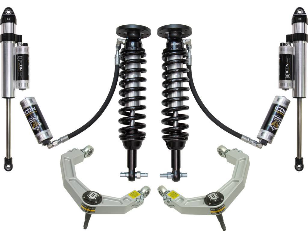 ICON Vehicle Dynamics 2015-2020 Ford F150 4WD suspension systems are designed with maximum performance and the serious driver in mind. ICON engineers primary focus is to increase wheel travel and damping ability, which translates into outstanding vehicle control and ride quality both on and off-road. The Stage 5 system includes vehicle-specific tuned 2.5†coilover shocks featuring remote reservoirs (with CDC Valves) for exceptional cooling properties and ICON-engineered Eibach coil springs for superior vehicle “feel†through the range of travel. These coilovers are also height adjustable from 0-2.5†of lift over stock allowing the use of larger, more aggressive wheel and tire combinations. Billet Aluminum upper control arms on the F-150 not only add strength and durability, but help retain factory alignment spec range increasing caster over stock. ICON 2.5 Aluminum Series piggyback reservoir rear shocks (with CDC Valves) utilize a vehicle-specific valving that balances the performance of the truck from front to rear. The ICON Vehicle Dynamics 2015-2020 F-150 4WD Stage 5 suspension system is an excellent choice for those drivers looking to enhance the capabilities of their pickup on the road as well as in the dirt.;This system features upper control arms with ICON's patented Delta Joint. The Delta Joint is a heavy duty high angle ball joint that combines the durability of a ball joint with the performance characteristics of a traditional uniball. While the industry standard uniball does a great job of allowing the control arms of a vehicle to articulate with little bind, they do have an inherent weakness that leaves more to be desired when used in a daily driven application - exposure to the elements. The Delta Joint features a zinc plated housing providing the first layer of corrosion resistance, while a tough grease seal keeps potentially harmful elements out of the inner workings of the joint. Metal on metal construction and a greasable design increase the longevity of the Delta Joint while at the same time allowing for noise-free operation. What makes the Delta Joint unique is that it brings the best of both worlds to ICON upper control arms with features that make it more robust than a uniball, and at the same time capable of greater angularity than a typical ball joint.