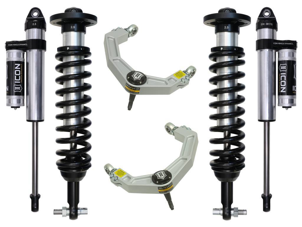 ICON Vehicle Dynamics 2015-2020 Ford F150 2WD suspension systems are designed with maximum performance and the serious driver in mind. ICON engineers primary focus is to increase wheel travel and damping ability, which translates into outstanding vehicle control and ride quality both on and off-road. The Stage 3 system includes vehicle-specific tuned 2.5†coilover shocks featuring an internal reservoir for exceptional cooling properties and ICON-engineered Eibach coil springs for superior vehicle “feel†through the range of travel. These coilovers are also height adjustable from 0-3†of lift over stock allowing the use of larger, more aggressive wheel and tire combinations. Billet aluminum upper control arms on the F150 not only add strength and durability, but help retain factory alignment spec range increasing caster over stock. ICON 2.5 Aluminum Series Piggyback rear shocks utilize a vehicle-specific valving that balances the performance of the truck from front to rear. 2.5" reservoir shocks ensure optimum performance by increasing the duration of consistent damping regardless of situation, keeping the shocks at a cooler operating temperature during heavy use. The ICON Vehicle Dynamics 2015-2020 F150 2WD Stage 3 suspension system is an excellent choice for those drivers looking to enhance the capabilities of their pickup on the road as well as in the dirt.;This system features upper control arms with ICON's patented Delta Joint. The Delta Joint is a heavy duty high angle ball joint that combines the durability of a ball joint with the performance characteristics of a traditional uniball. While the industry standard uniball does a great job of allowing the control arms of a vehicle to articulate with little bind, they do have an inherent weakness that leaves more to be desired when used in a daily driven application - exposure to the elements. The Delta Joint features a zinc plated housing providing the first layer of corrosion resistance, while a tough grease seal keeps potentially harmful elements out of the inner workings of the joint. Metal on metal construction and a greasable design increase the longevity of the Delta Joint while at the same time allowing for noise-free operation. What makes the Delta Joint unique is that it brings the best of both worlds to ICON upper control arms with features that make it more robust than a uniball, and at the same time capable of greater angularity than a typical ball joint.