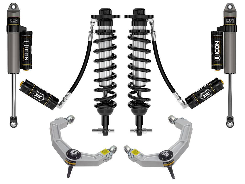 Stage 4 includes 2.5†coilovers with remote reservoirs with height adjustability from 0-3†of lift. Billet UCAs for alignment correction. ICON 2.5 Series piggyback rear rshocks balance the performance of the truck from front to rear.