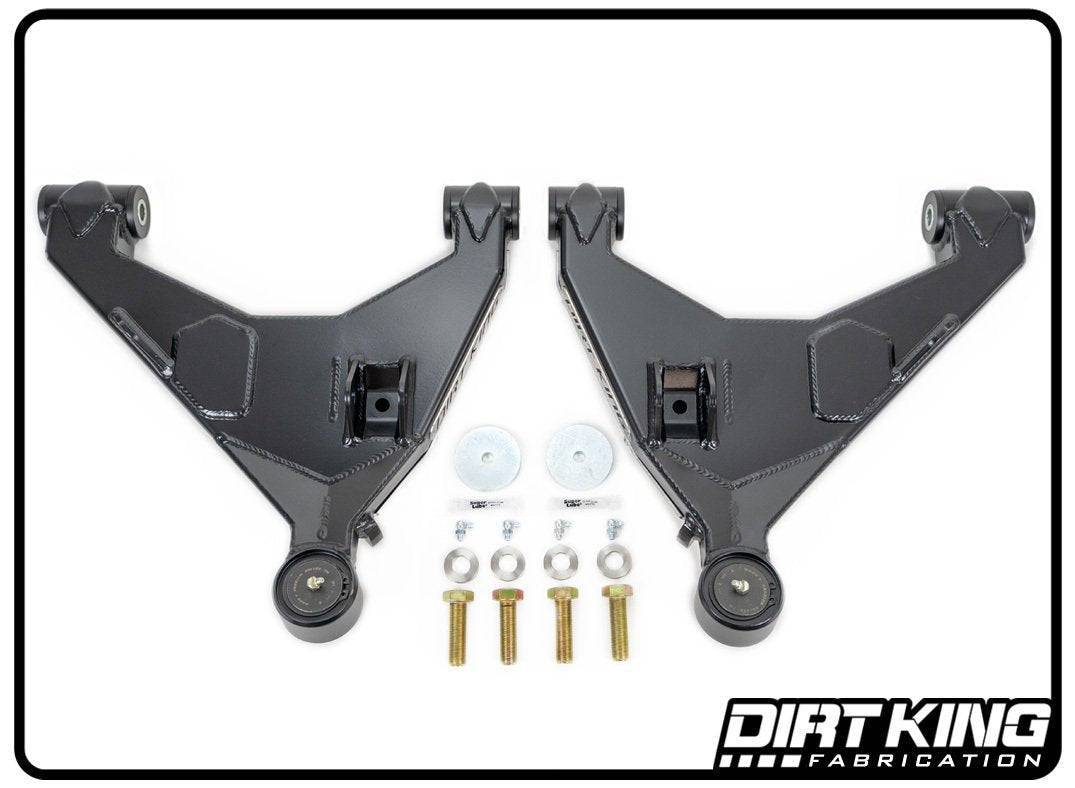 Additional features on the Dirt King lower control arms include recessed shock mounting with a drain hole and accepts all types of shocks and struts. It also accommodates for bump stops and limit straps. Progressive steering stops limit the steering throughout the suspension cycle to allow for maximum steering without over articulating the CV's or tie rods. This product is a direct bolt on application with all necessary hardware included. The arms are coated with a durable black powder coat and all the wearable components are replaceable for a product that will last a lifetime.
