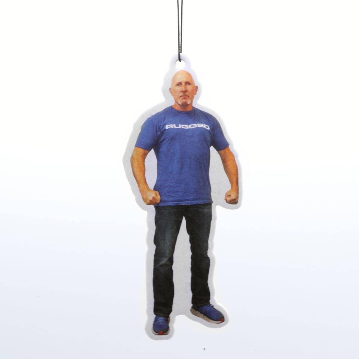 Flat Greg Air Freshener Work, Race, Play, and Smell Great features our President and Founder on a scented piece of cardboard with the classic elastic string, perfect for your rear view mirror.