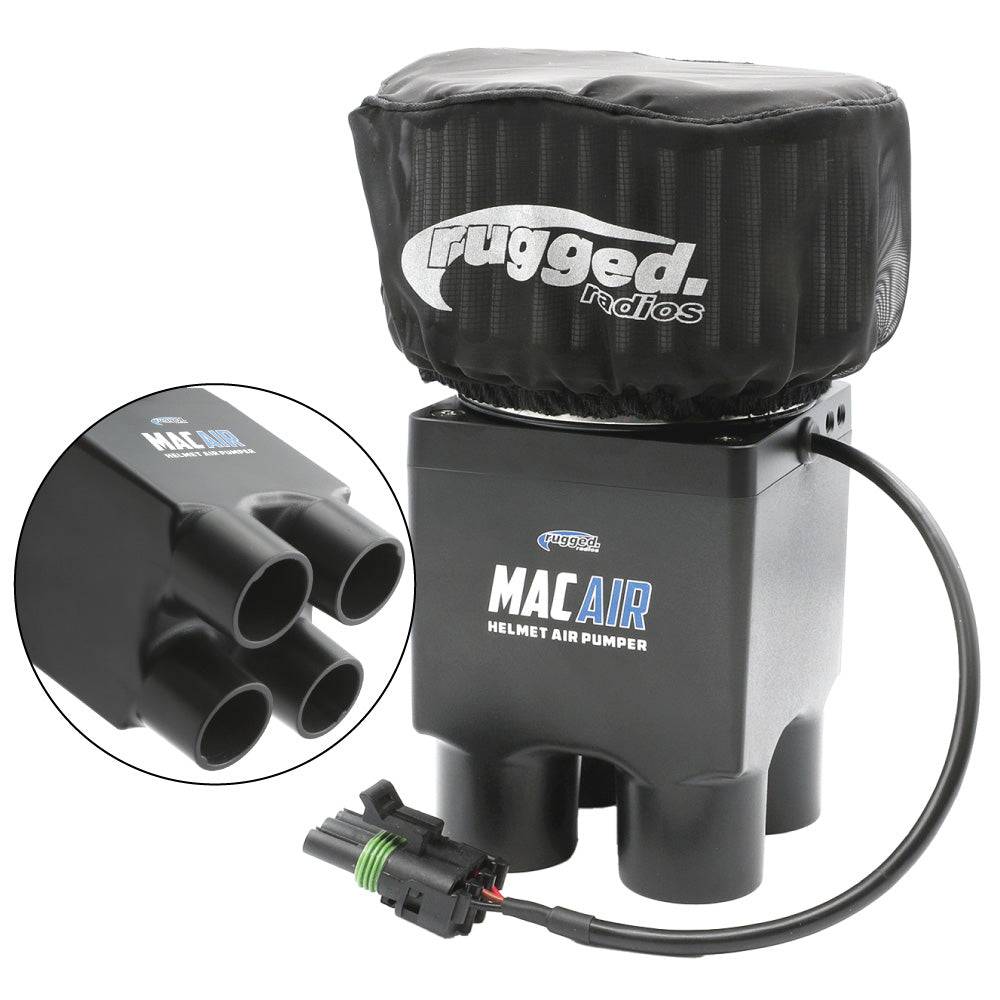 MAC Air 4-Person Helmet Air Pumper is constructed using injection-molded ABS polymer housing, optimized for increased airflow. Operating with a high static pressure fan, this model outperforms other helmet pumpers in pressure and volume. Using a dual filtering system, MAC Air enhances performance and avoids premature clogging. The micro openings in the external pre-filter catch most dust and debris before reaching the internal filter. Both filters are washable and reusable. This model has a 4-person helmet outlet, a high duty cycle life motor, a waterproof power connector, and a 12' power cord. Mounting can be achieved with exclusive half clamp bar mounts. MAC Air is built to race.