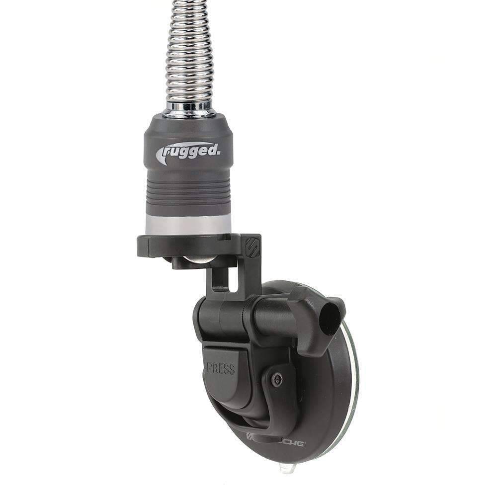 Suction Cup Antenna Mount delivers more antenna mounting options. Built tough and swiveling, this can be mounted on any angle or non-porous surface such as clean body panels and windows. This is ideal for aluminum or fiberglass bodied trucks and vehicles that cannot use a magnet mount, chase vehicles and motorhomes when drillings into the roof aren't desired. Scosche developed this for Rugged Radios to offer durable and secure antenna mounting options when there aren't many. This requires a non-ground-plane (NGP) antenna such as Rugged Radios VHF-1/2W-SPR or the POINT5 and Rugged Radios NMO-MT-15, a popular NMO Cable Mount option with 15 feet of cable.
