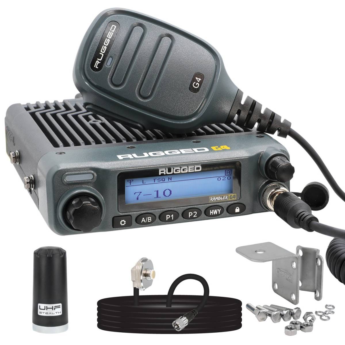 Radio Kit Lite - Rambler G4 GMRS Band Mobile Radio with Stealth Antenna is designed for clear, powerful communication particularly in enclosed cab vehicles. With a large, clear, and easy-to-read display, programmable controls are instantly accessible. Over 46 watts of power ensure power consistency and transmission performance. The G4 was created with Mitsubishi amplifier for stable power, maintaining consistency during continuous transmissions. Equipped with RIDEui for navigation, customization of settings and advanced features with an LED display. The device has integrated AMPS mounting system, compatible with RAM mounts, offering versatile mounting options. With all standard GMRS channels and 259 privacy codes, it provides high or low power settings. The G4 comes with features such as adjustable brightness, tone code, squelch, and Roger Beep. Connectivity is established easily with intercom, headset, or 5-pin accessory using an optional jumper. The kit includes a radio, hand mic with a magnetic mount, universal U-Bracket, DC power cable, Rambler Adventure Patch, Rip-Stop Hand Mic Bag, UHF Stealth Antenna, NMO bar Mount Universal Antenna Bracket and Antenna Coax Cable. Compatibility includes all GMRS radios including, but not limited to, Rugged G1, GMR45, GMR25, GMR2 and GMR2 PLUS from various manufacturers, as well as FRS radios on channels 1-7 and 15-22.