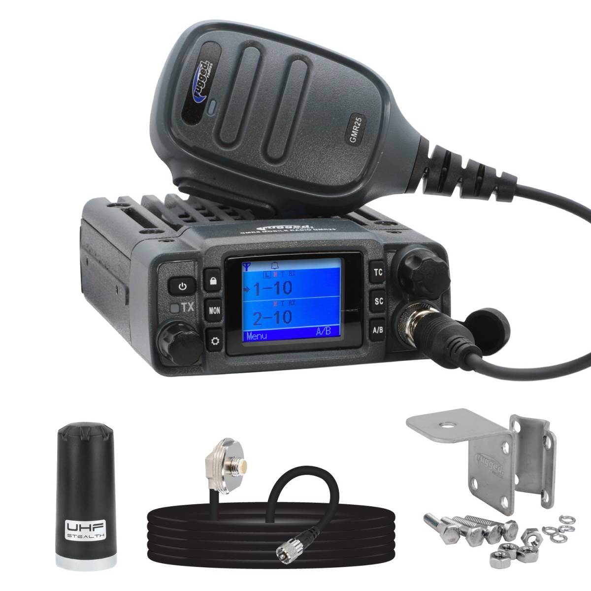 Radio Kit Lite - GMR25 Waterproof GMRS Mobile Radio with Stealth Antenna is a rugged, waterproof 25-watt GMRS radio ideal for Jeeps, UTVs, and other open-cab vehicles. With a 10-12 mile range, it connects instantly to all other GMRS radios, providing flexibility on the trail. The Rugged Ready Port enables connection with intercom, headset, multi radio box and other RRG accessories via the built-in 5 pin pigtail cable. Features include 15 GMRS channels (1-7 & 15-22), 8 repeater channels, IP67 water resistance, Scosche Magentic MagicMount Hand Mic, UHF low profile Stealth Antenna, Universal Antenna Mount, Dual Watch Mode, Battery Voltage Display, Adjustable Squelch, Tone Code, Lock Function, Speaker Port, Backlight, Channel Scan and is 4-3/16inW x 5inD x 1-9/16inH in size. The kit includes GMR25 Radio, Hand Mic, Radio Mount, DC power cable with fuse holder, Hardware Pack, Protection Fuse, Antenna, Antenna Mount, 15 Ft Antenna Coax Cable. It is compatible with all GMRS radios, including Rugged GMR45, GMR25, GMR2, and GMR2 PLUS along with radios from Motorola, Midland, Uniden, and FRS radios on channels 1-7 and 15-22.