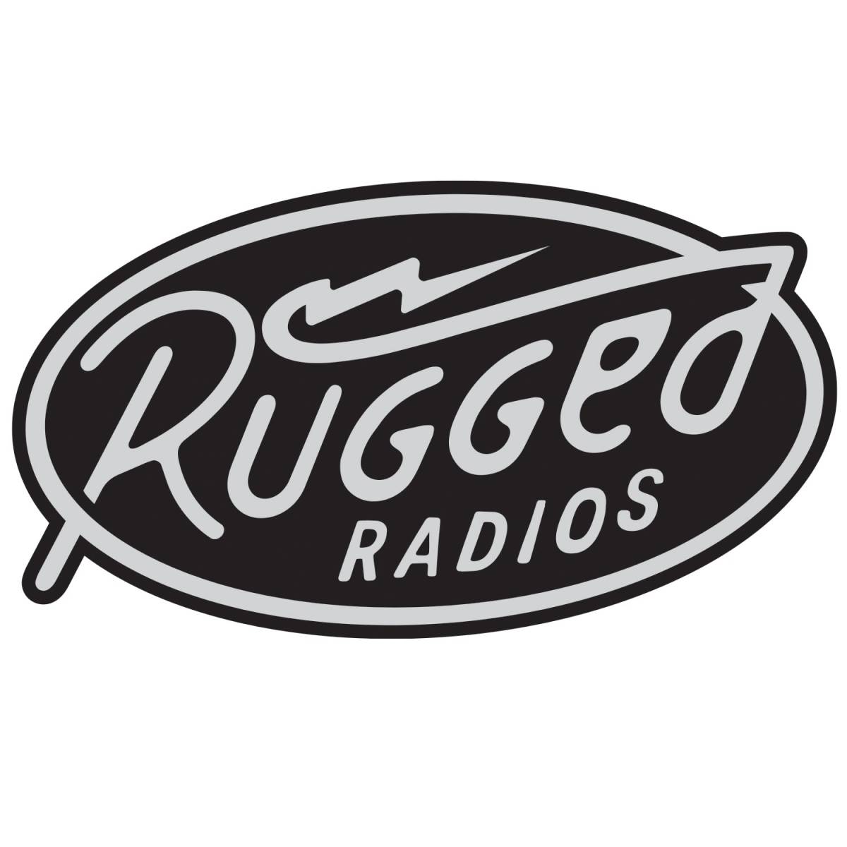 Rugged Radios Bolt Logo Sticker features a clean black and grey color scheme and strong adhesive.